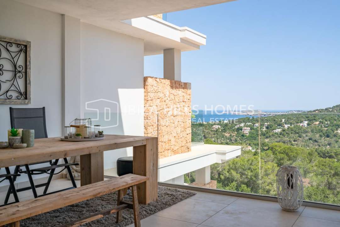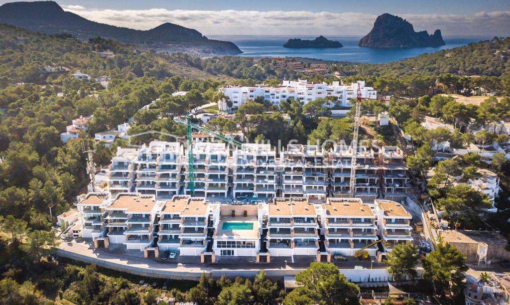 Moderne 2-Schlafzimmer-Wohnung zum Verkauf in Cala Vadella, Ibiza, mit Meerblick, privater 32 m² Terrasse, Pool, Spa, Fitnessraum, Tiefgaragenstellplatz und Abstellraum, nahe...