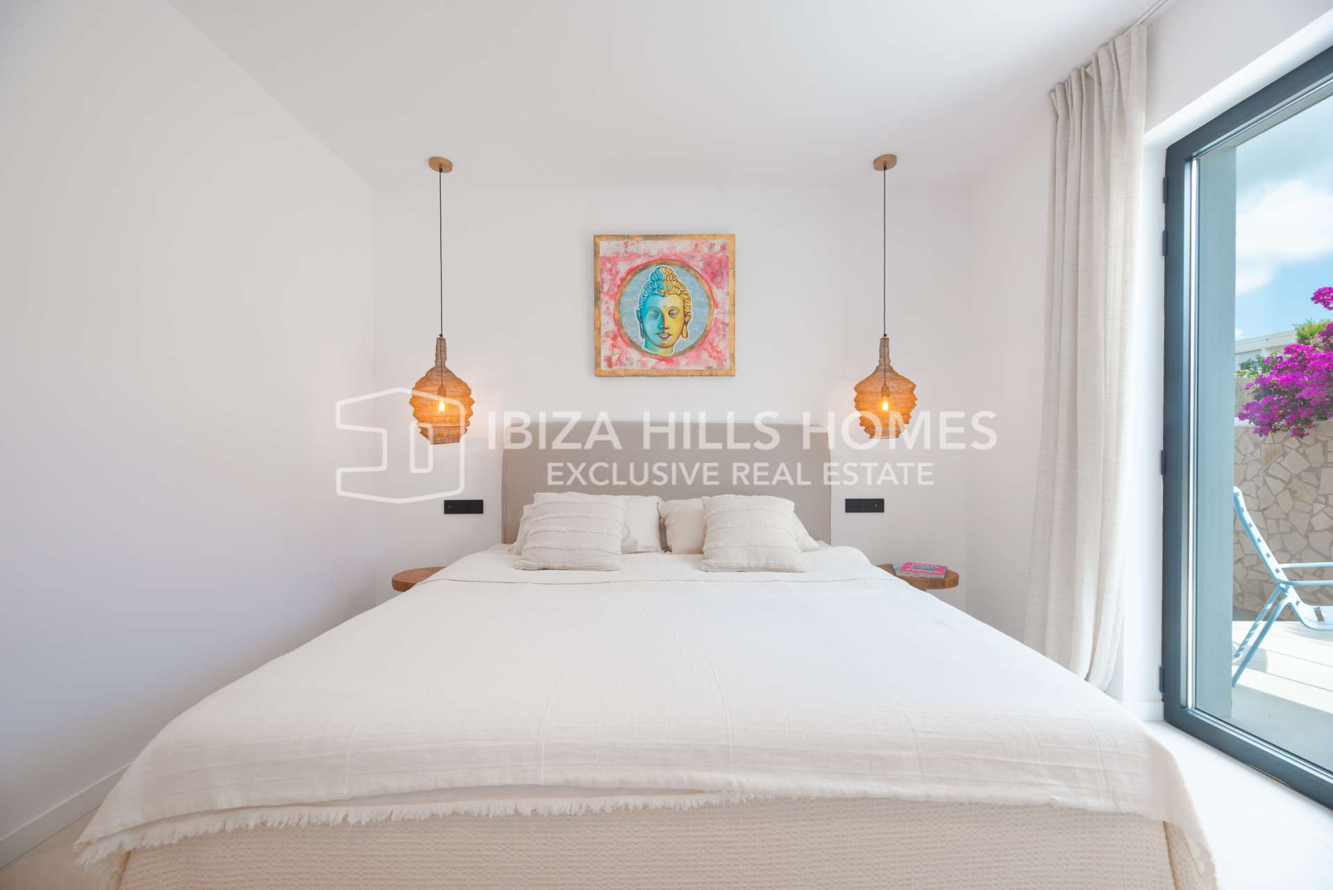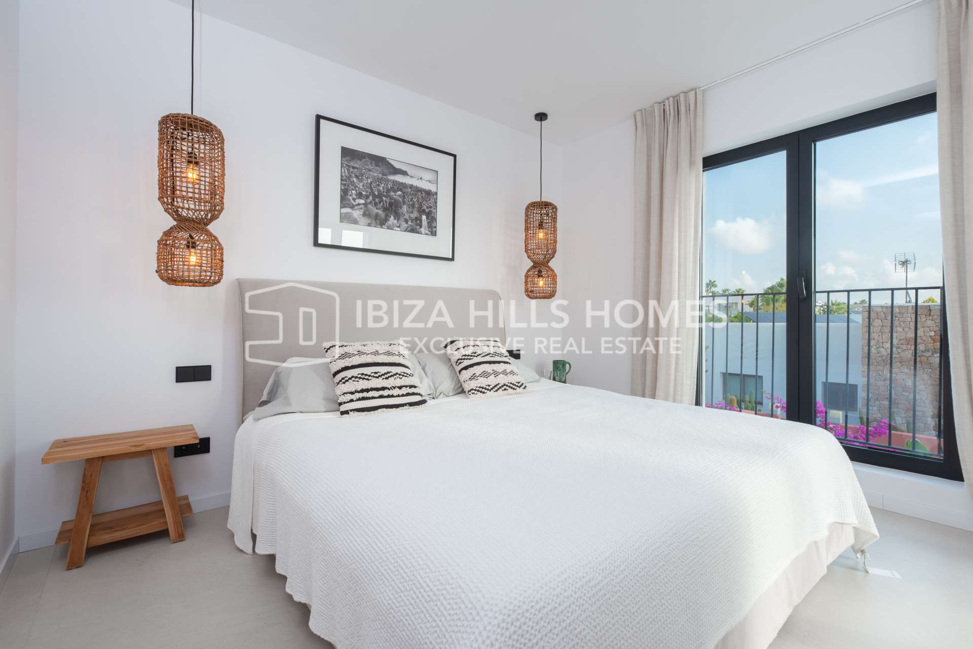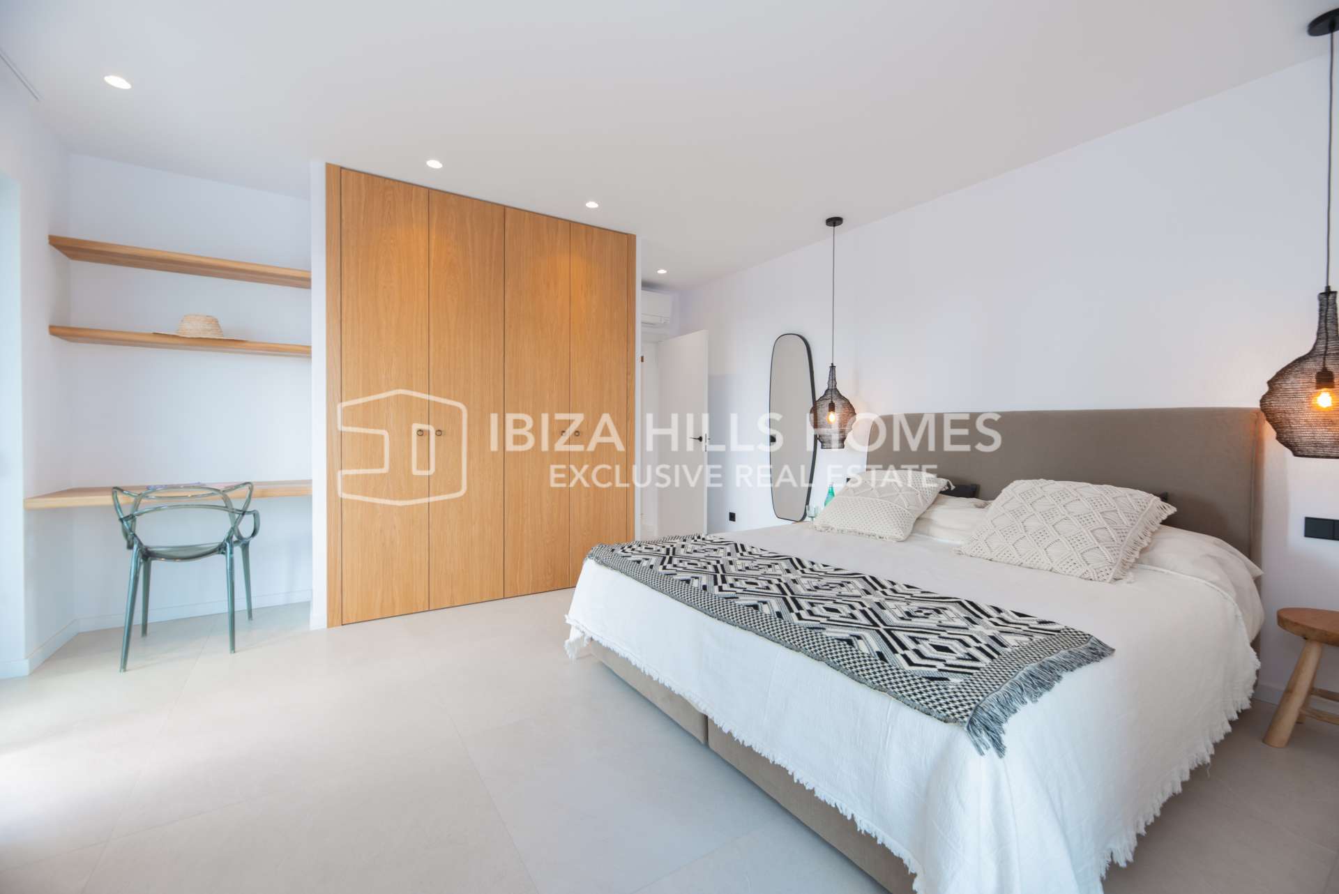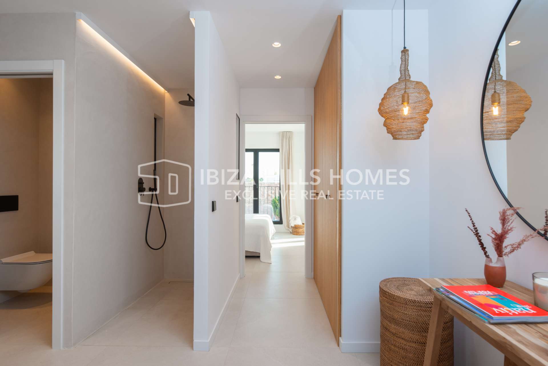 Die Schlafzimmer sind großzügig geschnitten und mit Einbauschränken ausgestattet. Die luxuriösen Badezimmer verfügen über edle Materialien, eines davon mit Zugang zu einer privaten Terrasse und einer freistehenden Badewanne im Freien. Die Mastersuite bietet einen privaten Rückzugsort mit herrlichem Blick auf die Landschaft Ibizas.