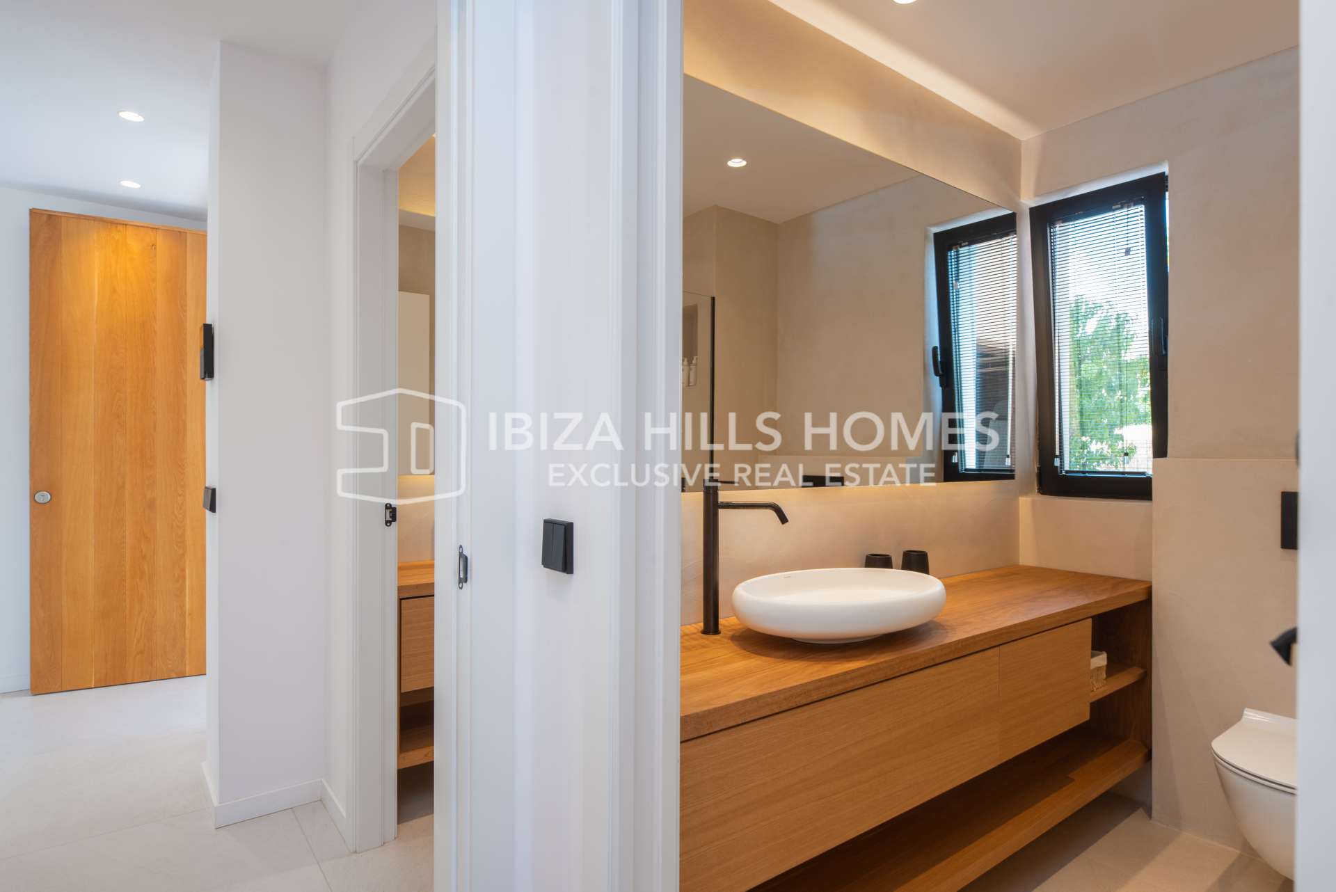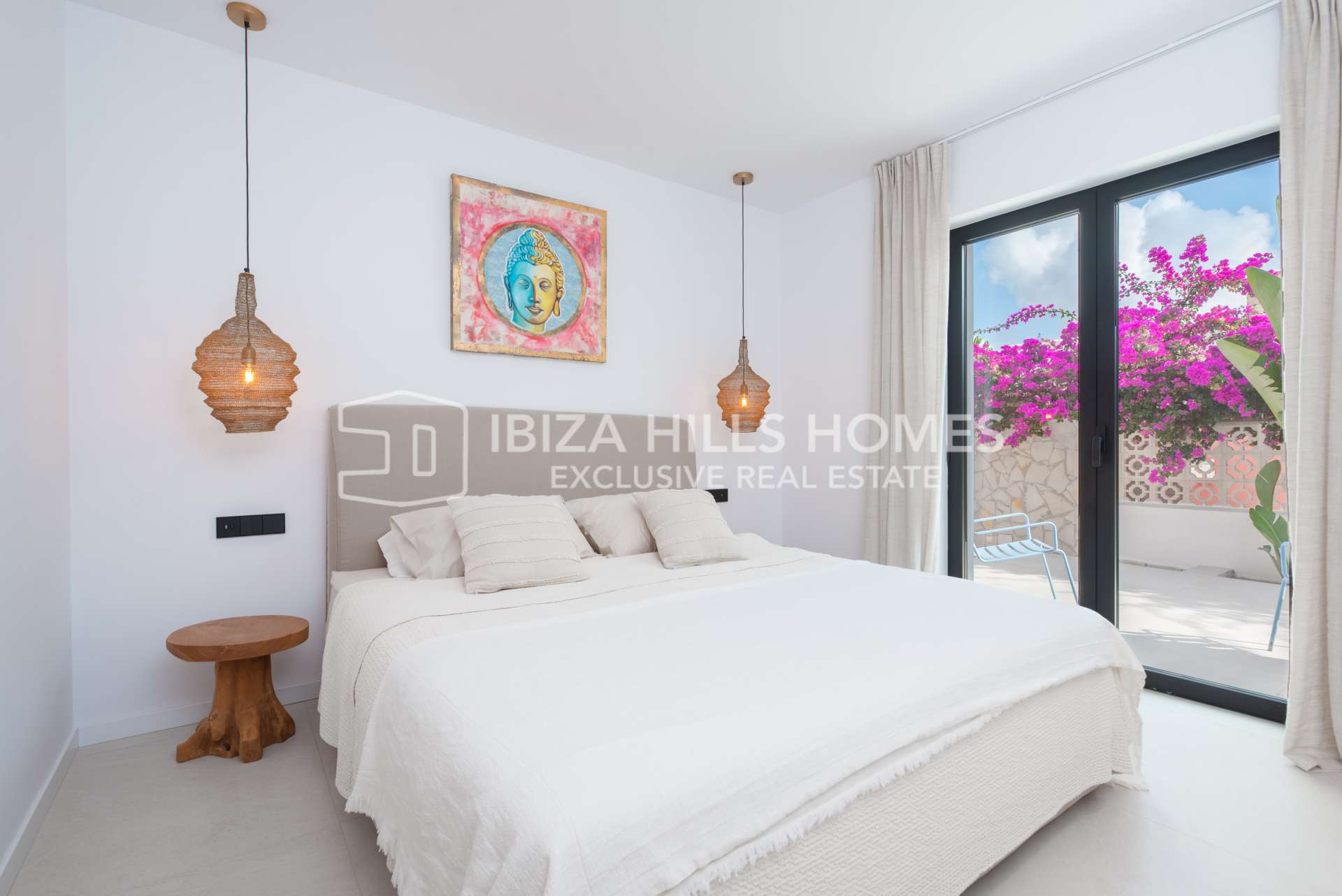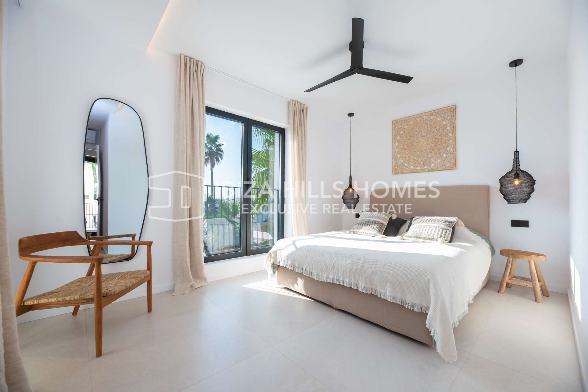 Die Schlafzimmer sind großzügig geschnitten und mit Einbauschränken ausgestattet. Die luxuriösen Badezimmer verfügen über edle Materialien, eines davon mit Zugang zu einer privaten Terrasse und einer freistehenden Badewanne im Freien. Die Mastersuite bietet einen privaten Rückzugsort mit herrlichem Blick auf die Landschaft Ibizas.
