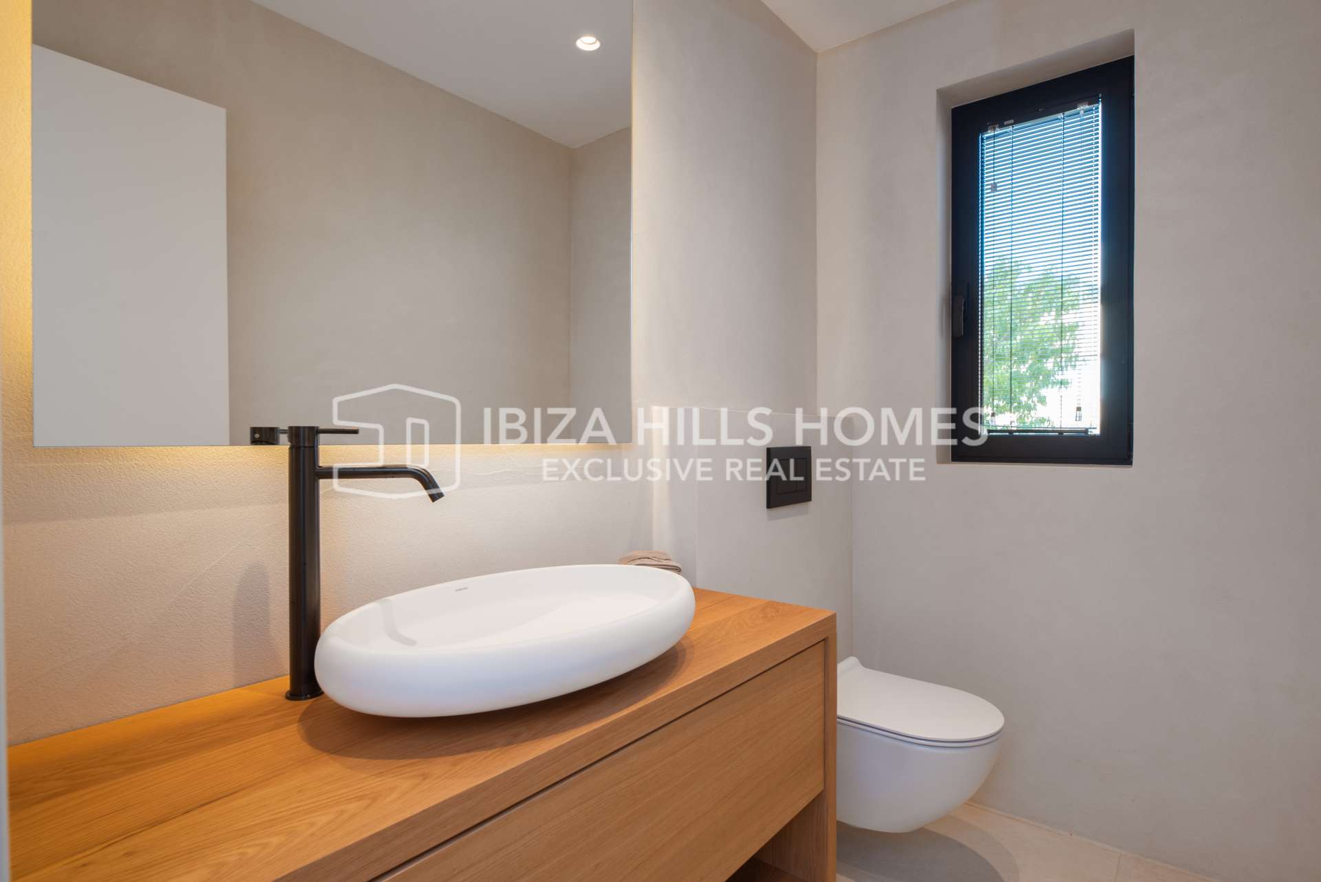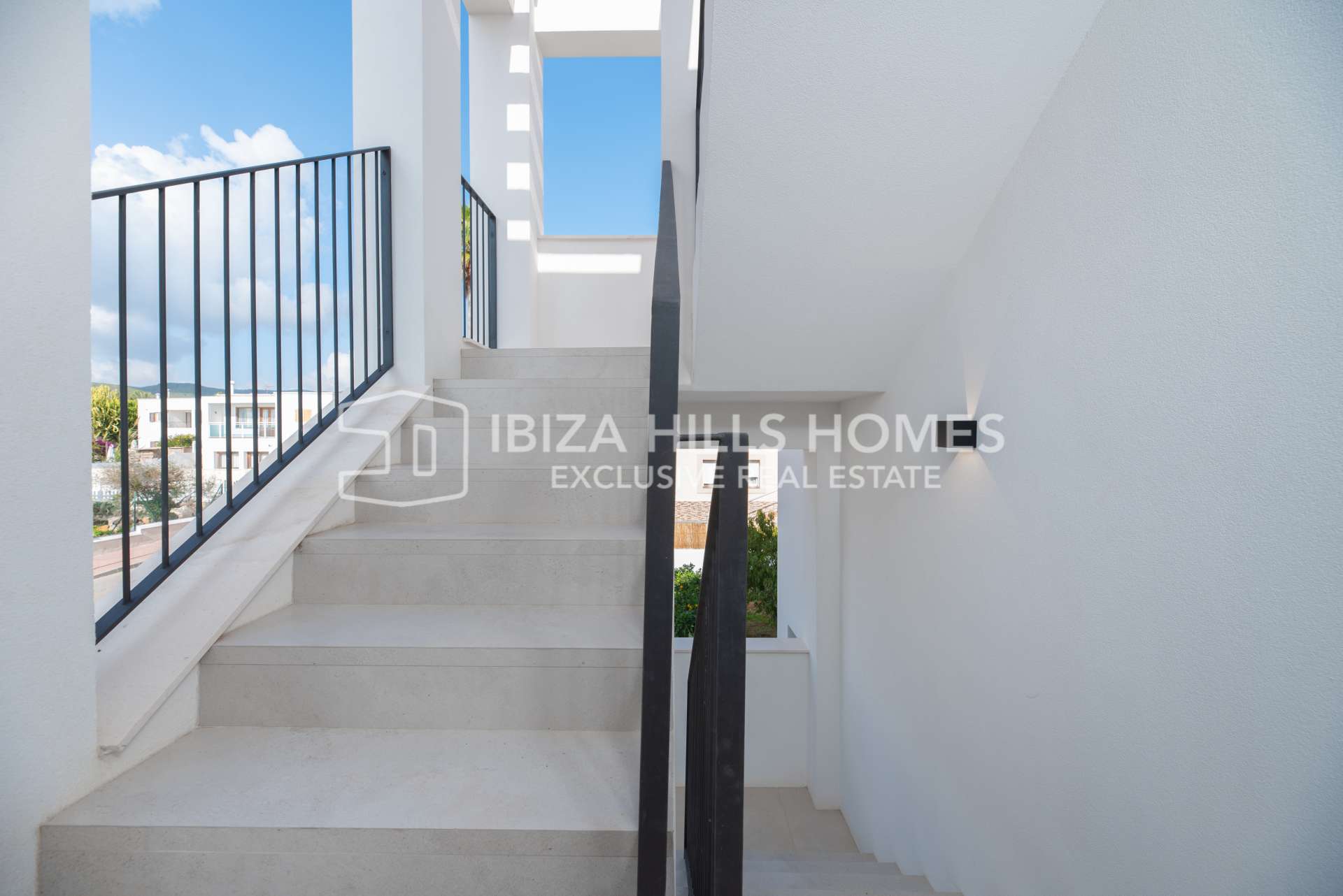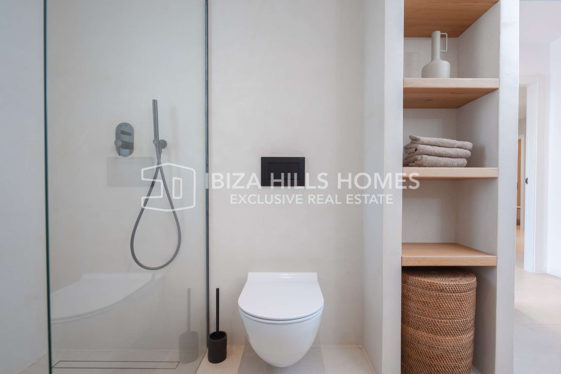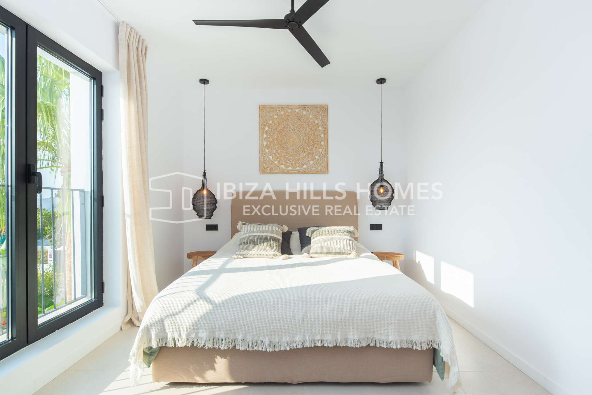 Die Schlafzimmer sind großzügig geschnitten und mit Einbauschränken ausgestattet. Die luxuriösen Badezimmer verfügen über edle Materialien, eines davon mit Zugang zu einer privaten Terrasse und einer freistehenden Badewanne im Freien. Die Mastersuite bietet einen privaten Rückzugsort mit herrlichem Blick auf die Landschaft Ibizas.