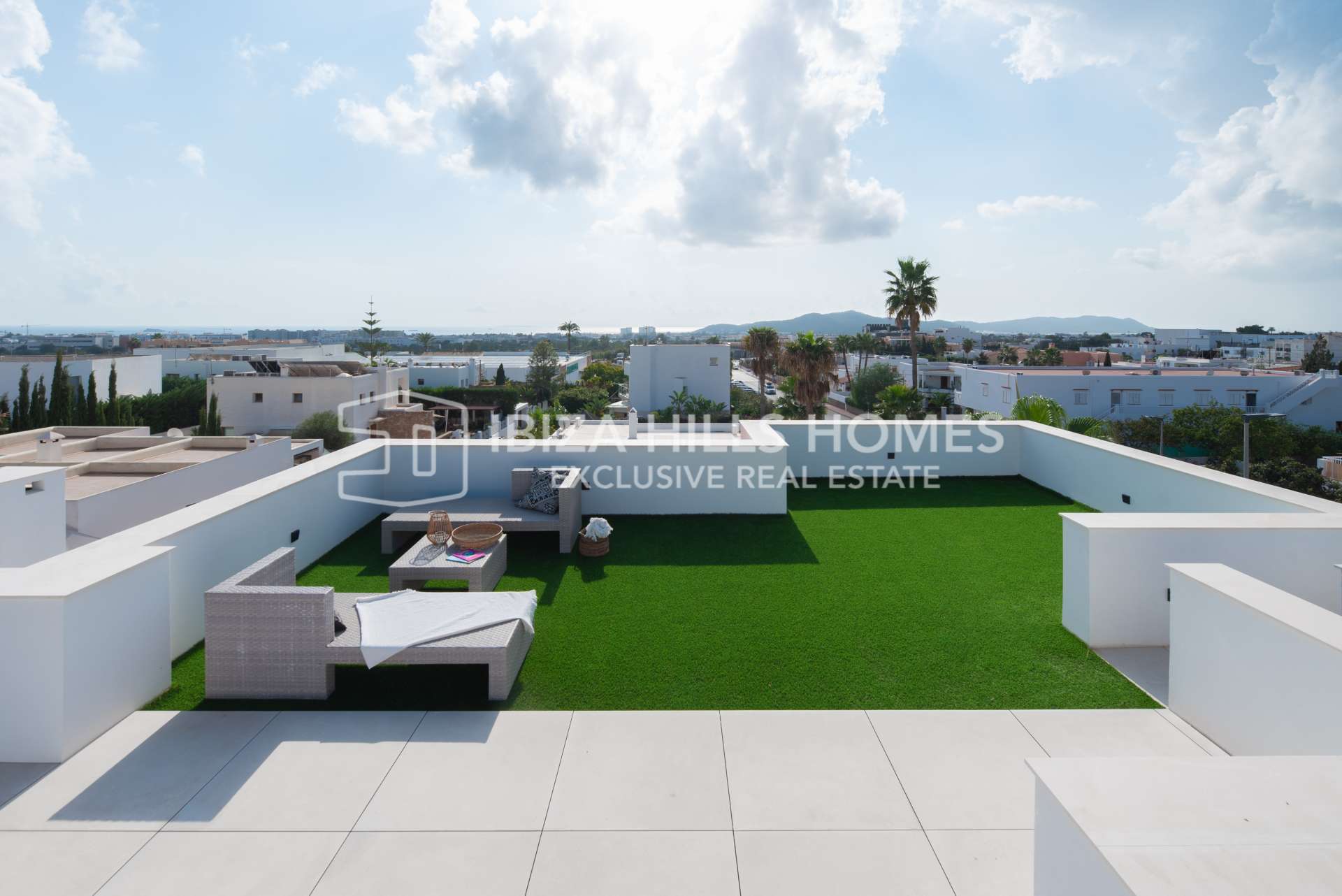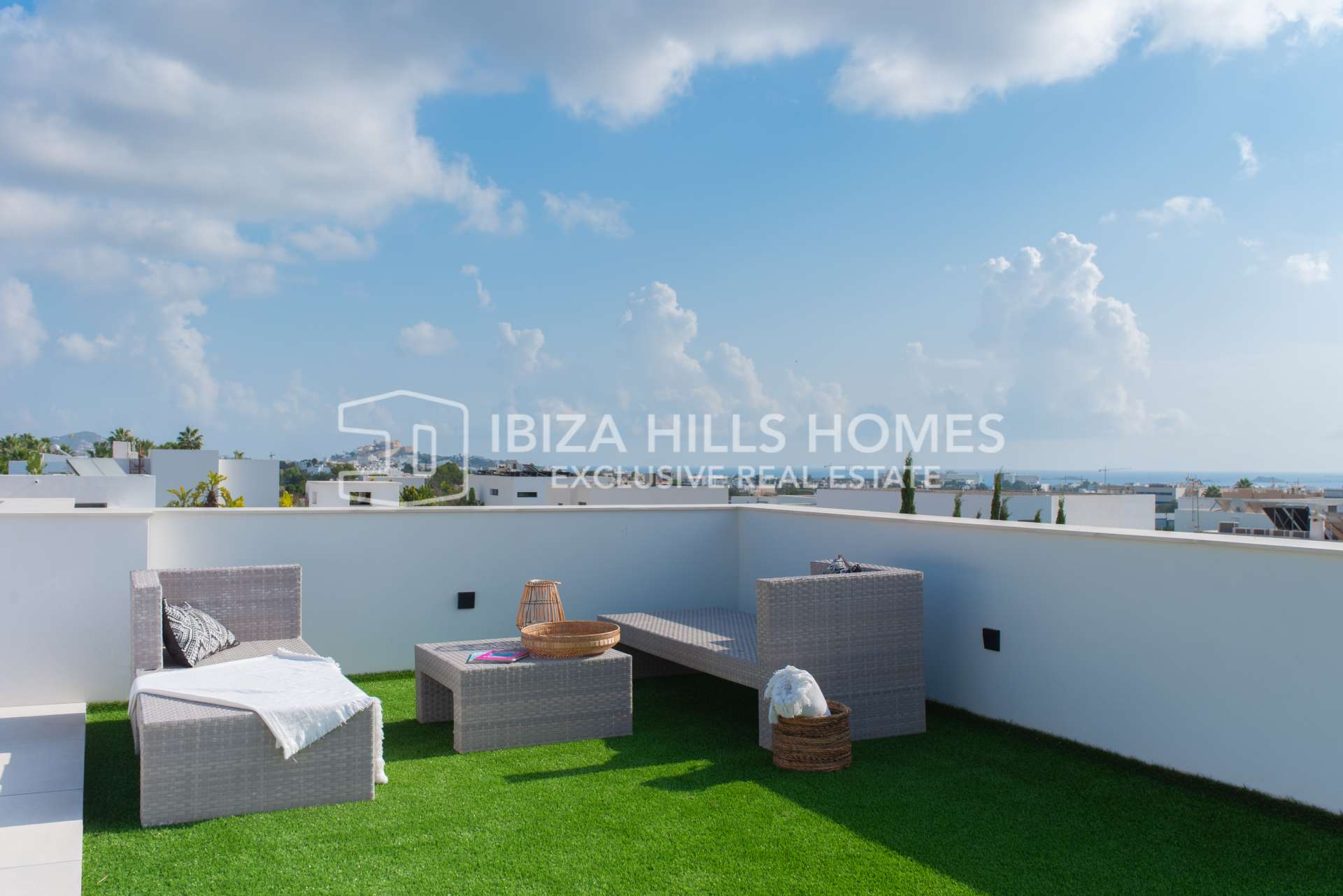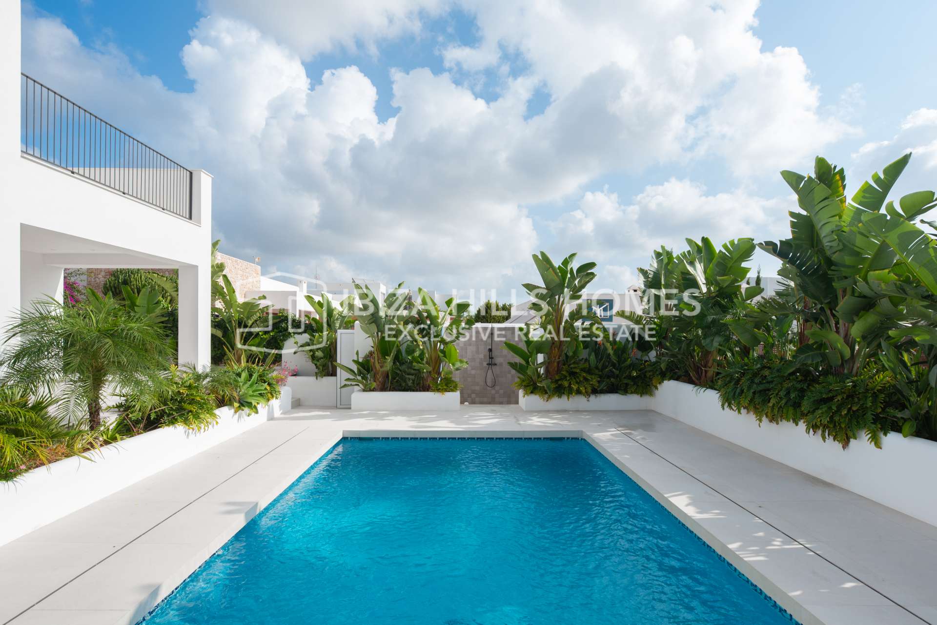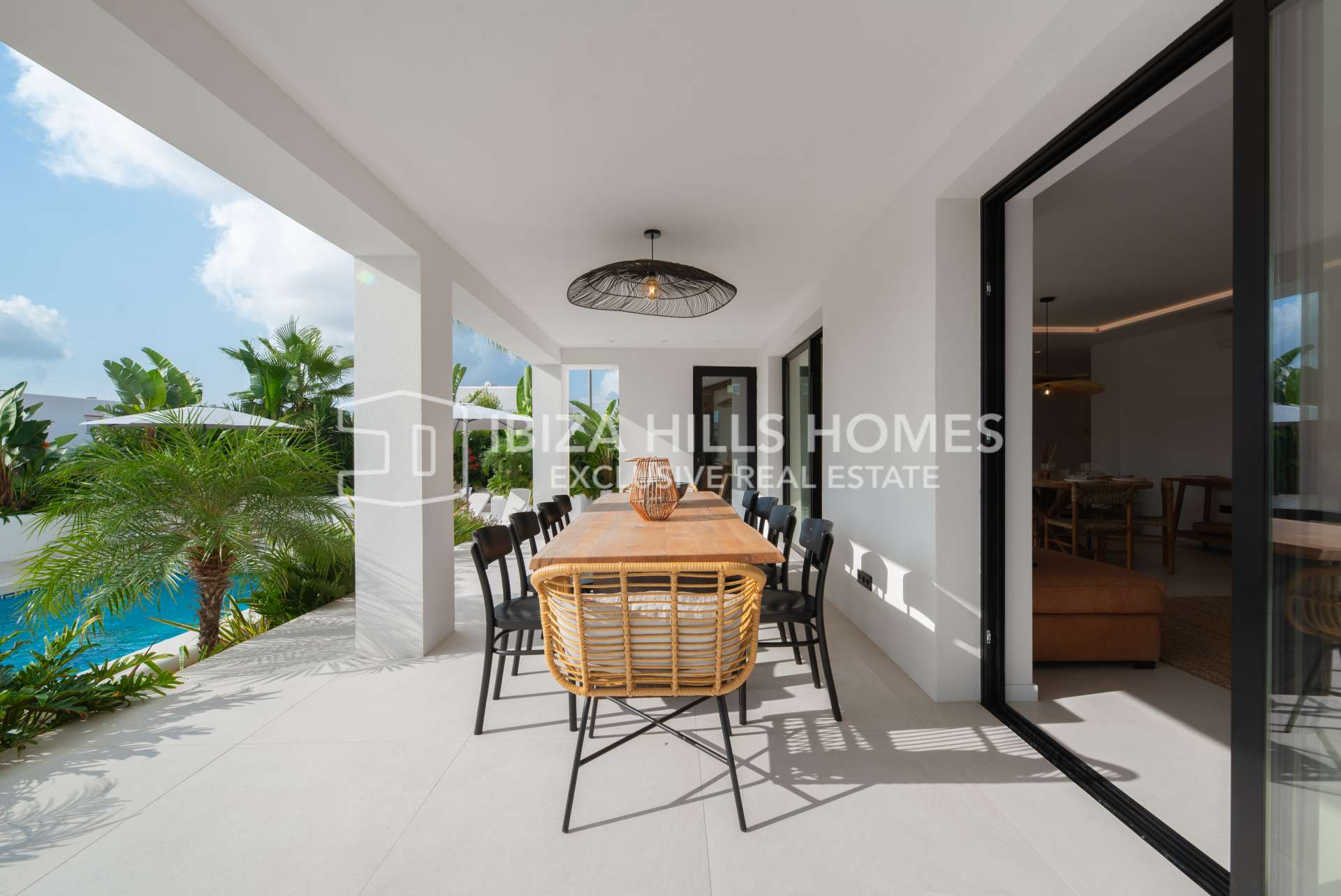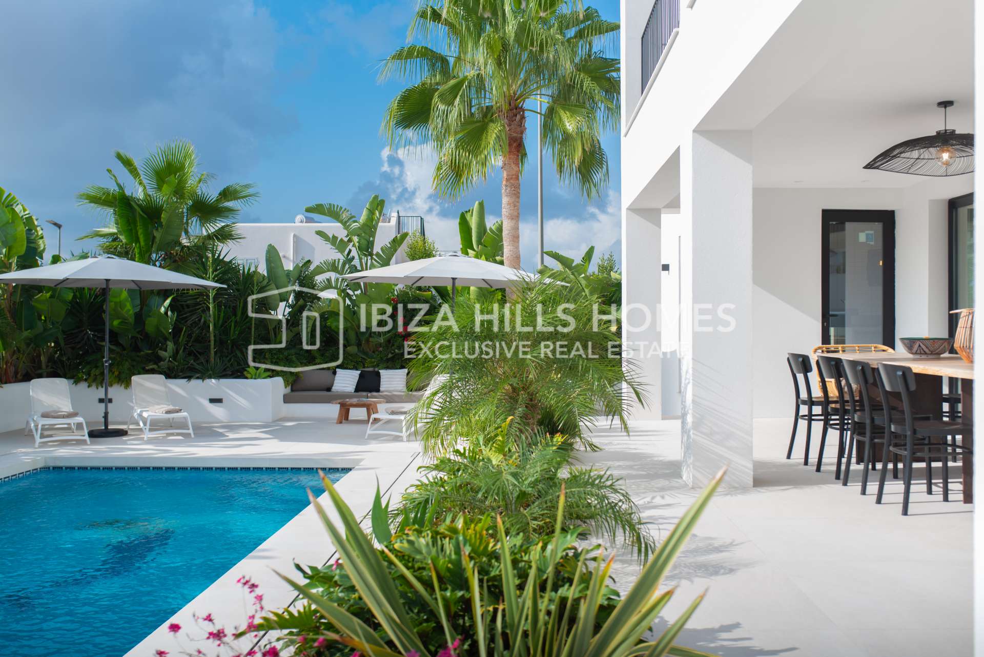 Der Außenbereich begeistert mit einem privaten Pool, großzügigen Terrassen zum Entspannen und Essen im Freien, einem überdachten Lounge-Bereich und gepflegten Gärten, die Privatsphäre und Ruhe garantieren. Auf der Dachterrasse genießen Sie einen atemberaubenden Panoramablick auf Dalt Vila und das Tal – perfekt, um den Sonnenuntergang zu erleben.