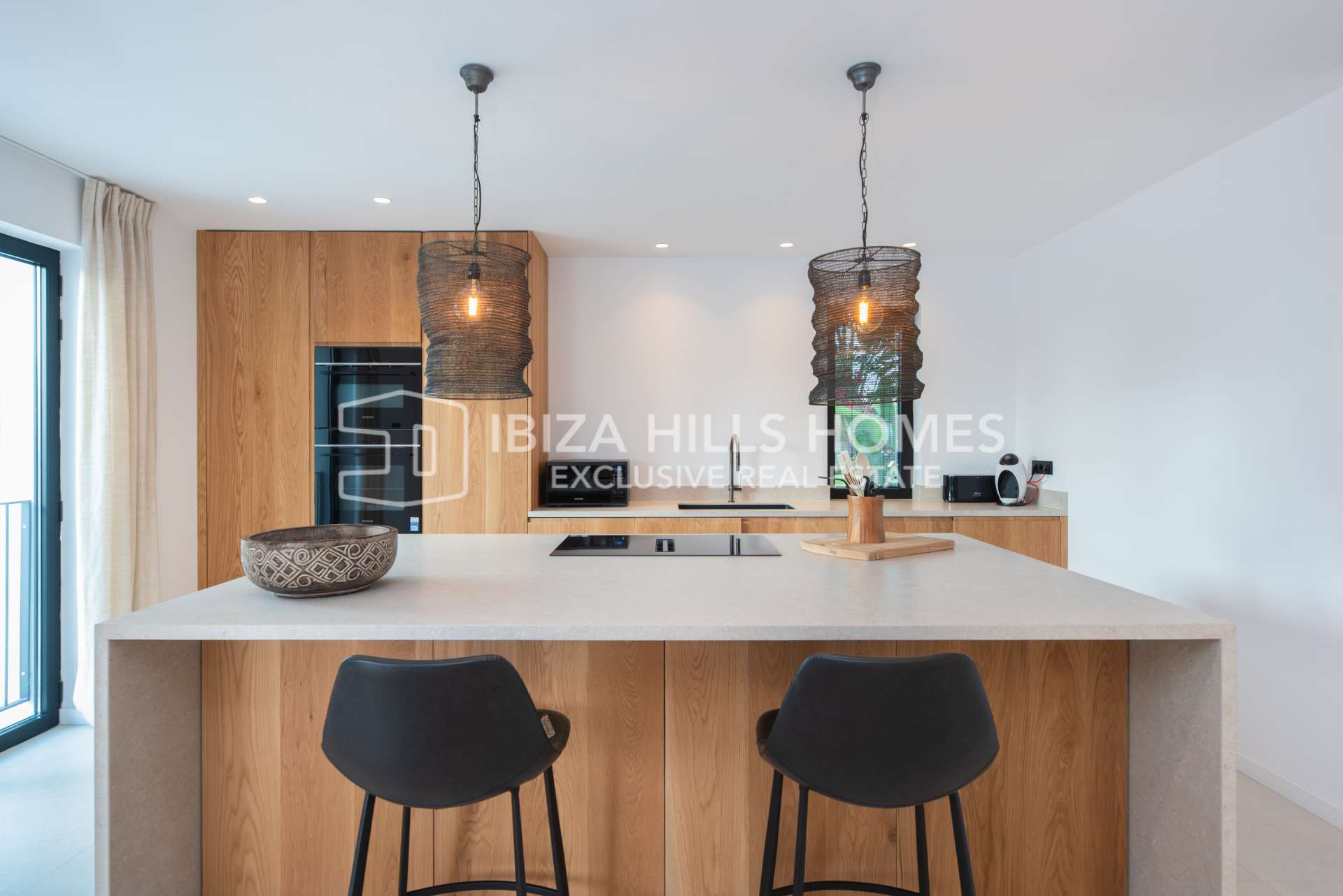 Die lichtdurchfluteten Innenräume überzeugen durch ein offenes Raumkonzept, das Wohnzimmer, Essbereich und Küche nahtlos miteinander verbindet. Große bodentiefe Fenster sorgen für Helligkeit und schaffen einen fließenden Übergang zwischen Innen- und Außenbereich. Die Designerküche mit Kochinsel und hochwertigen Materialien kombiniert Funktionalität mit modernem Stil.