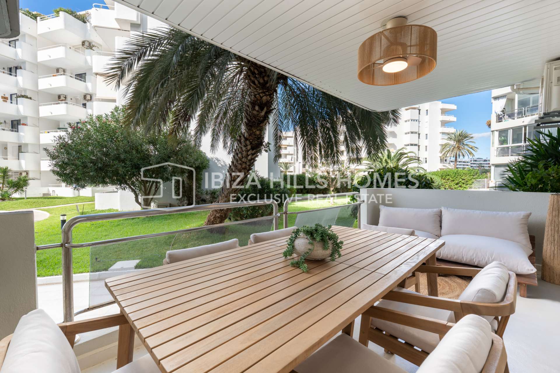 Vom Wohnzimmer aus gelangt man auf eine wunderschön gestaltete private Terrasse mit ruhigem Blick auf Dalt Vila. Natürliche Farbtöne und Materialien verbinden Innen- und Außenbereiche zu einem fließenden Wohnkonzept. Umgeben von Pflanzen und bequemen Sitzgelegenheiten ist die Terrasse der ideale Ort, um Ibizas Sonne zu genießen – mit Privatsphäre und Ruhe, mitten im lebendigen Hafenviertel.
