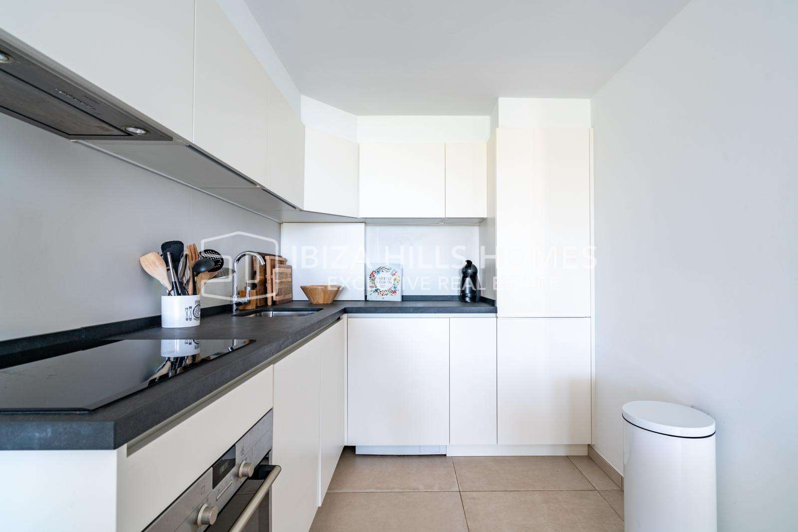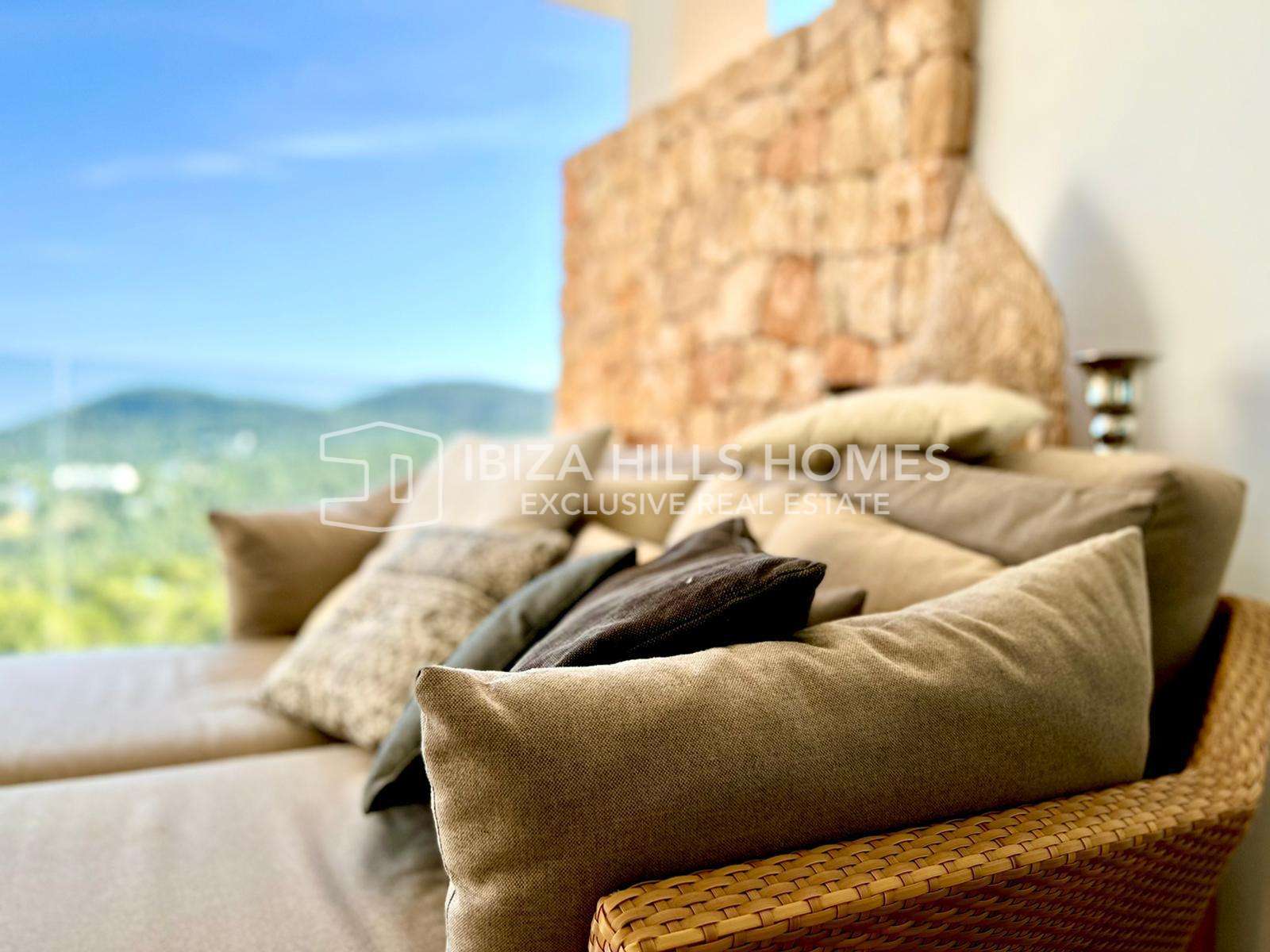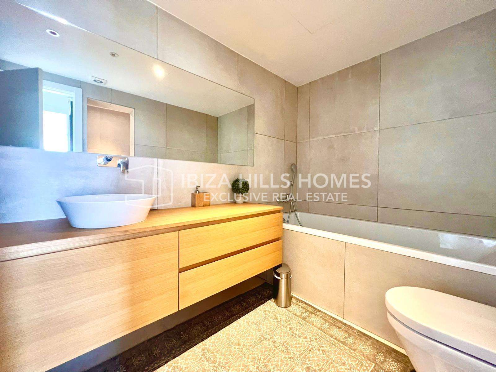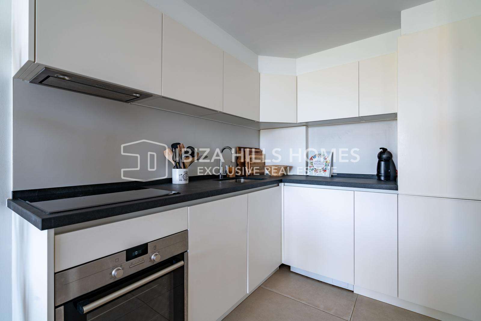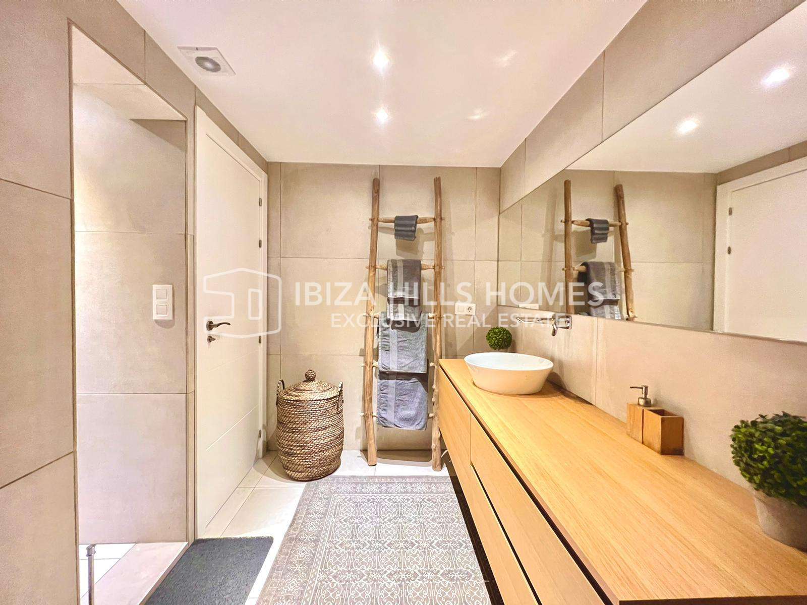 Ein besonderes Highlight ist die großzügige private Terrasse von 33 m², die eine harmonische Verbindung zwischen Innen- und Außenbereich bietet und zudem einen schönen Meerblick ermöglicht. Dieser Außenbereich eignet sich perfekt für Mahlzeiten im Freien, Entspannung oder um die spektakulären Sonnenuntergänge Ibizas zu genießen.