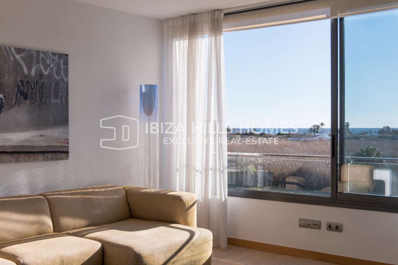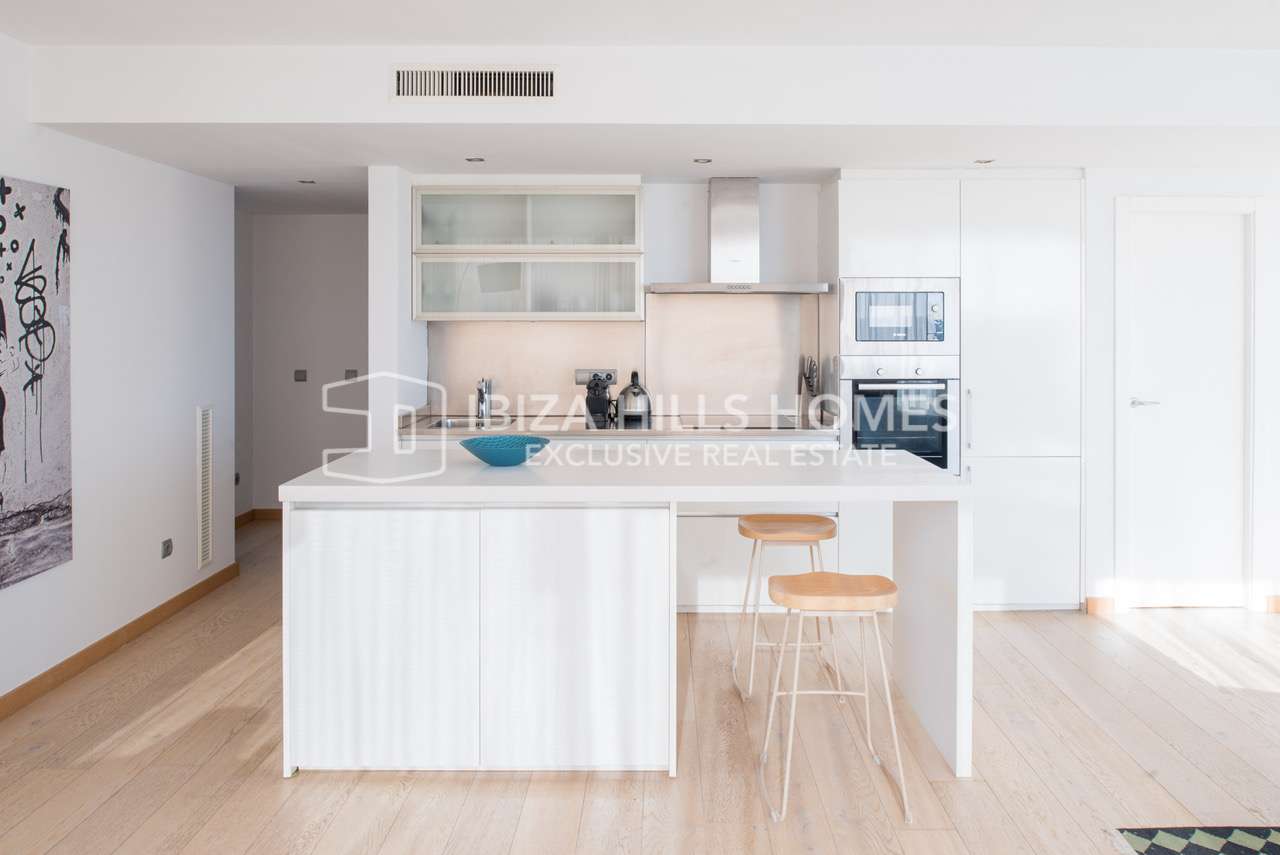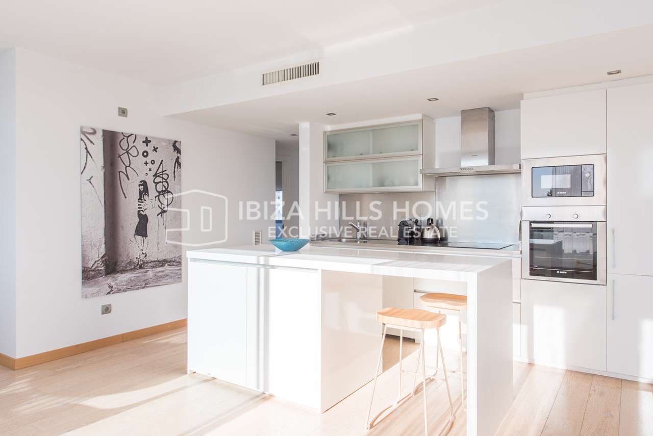 Die Wohnung befindet sich im zweiten Obergeschoss eines gepflegten Gebäudes und verfügt über ca. 117 m² Wohnfläche. Herzstück ist der helle und großzügige Wohn- und Essbereich im offenen Grundriss. Große Fensterfronten sorgen für viel Tageslicht und unterstreichen das luftige Raumgefühl. Von hier aus gelangt man direkt auf den Balkon, der einen schönen Blick auf das Meer bietet und den mediterranen Lebensstil Ibizas perfekt widerspiegelt.