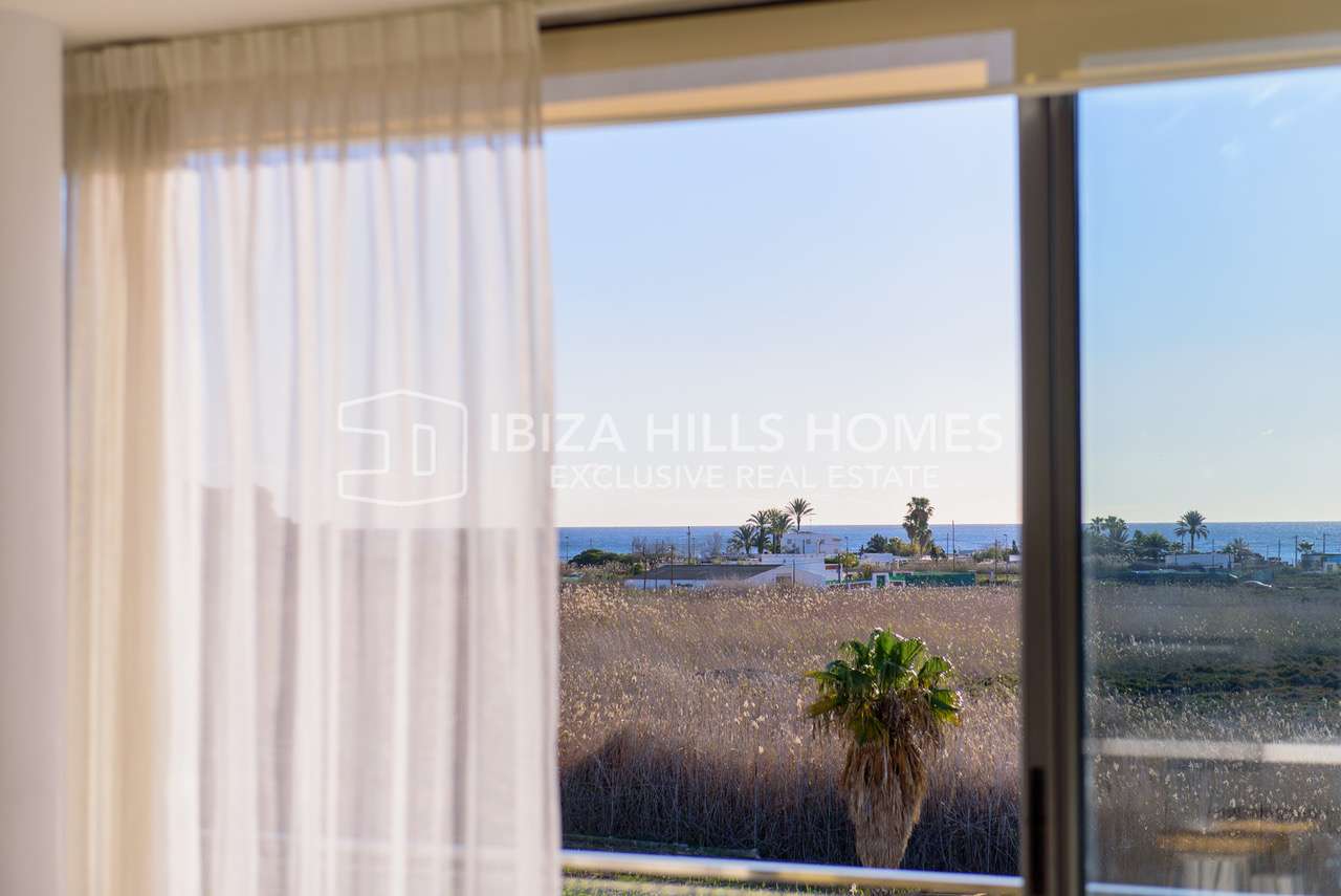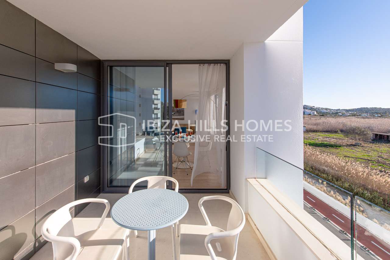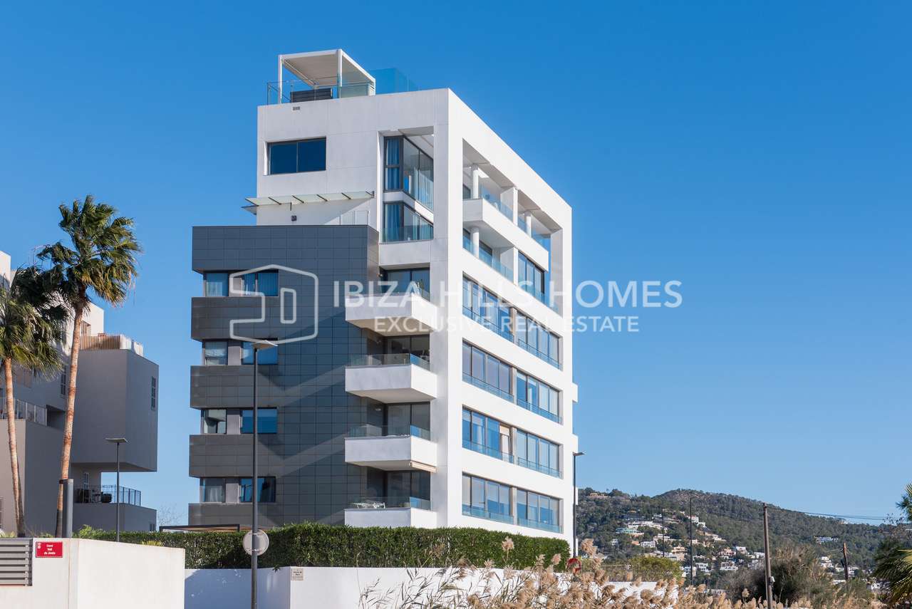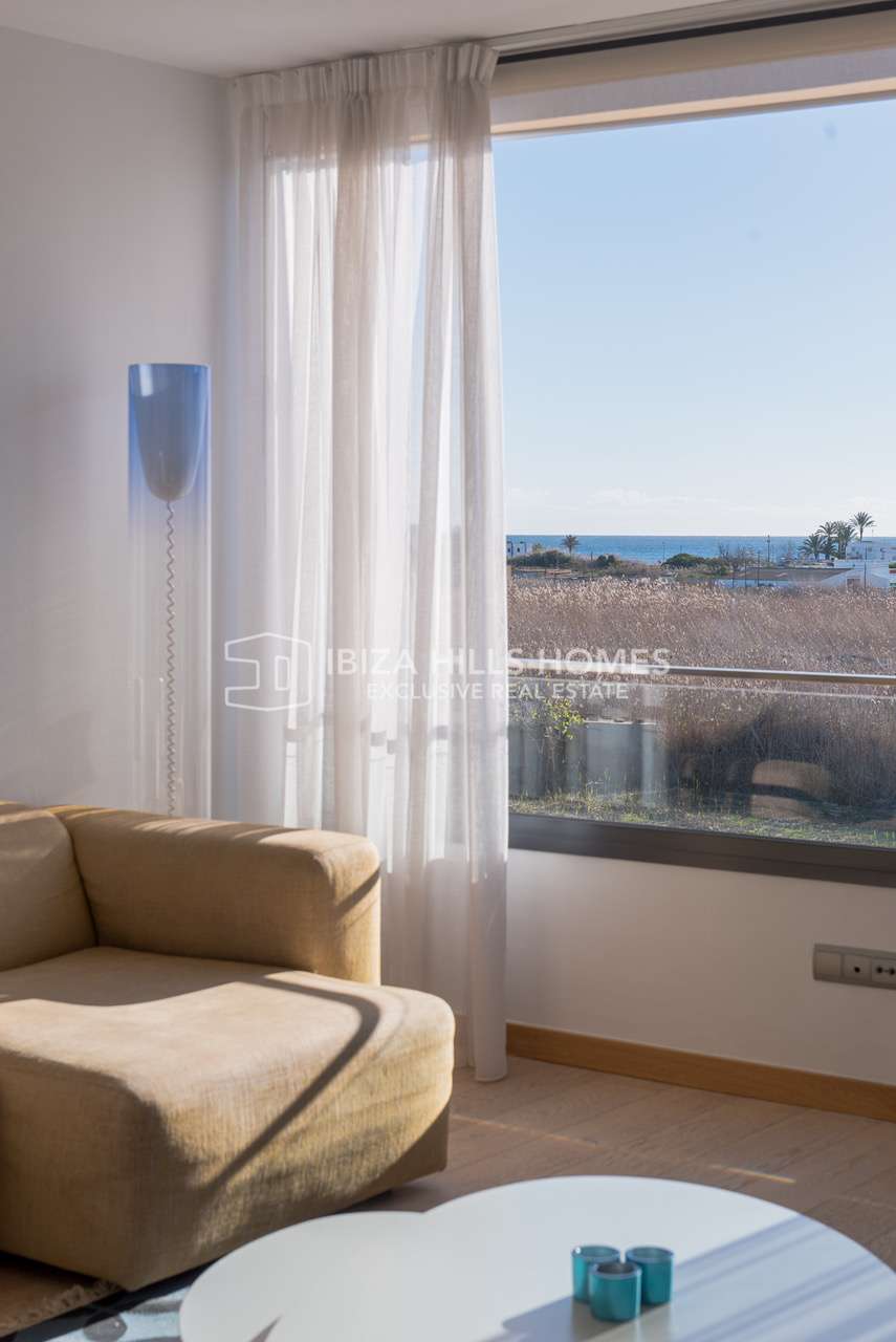 Die Wohnung befindet sich im zweiten Obergeschoss eines gepflegten Gebäudes und verfügt über ca. 117 m² Wohnfläche. Herzstück ist der helle und großzügige Wohn- und Essbereich im offenen Grundriss. Große Fensterfronten sorgen für viel Tageslicht und unterstreichen das luftige Raumgefühl. Von hier aus gelangt man direkt auf den Balkon, der einen schönen Blick auf das Meer bietet und den mediterranen Lebensstil Ibizas perfekt widerspiegelt.
