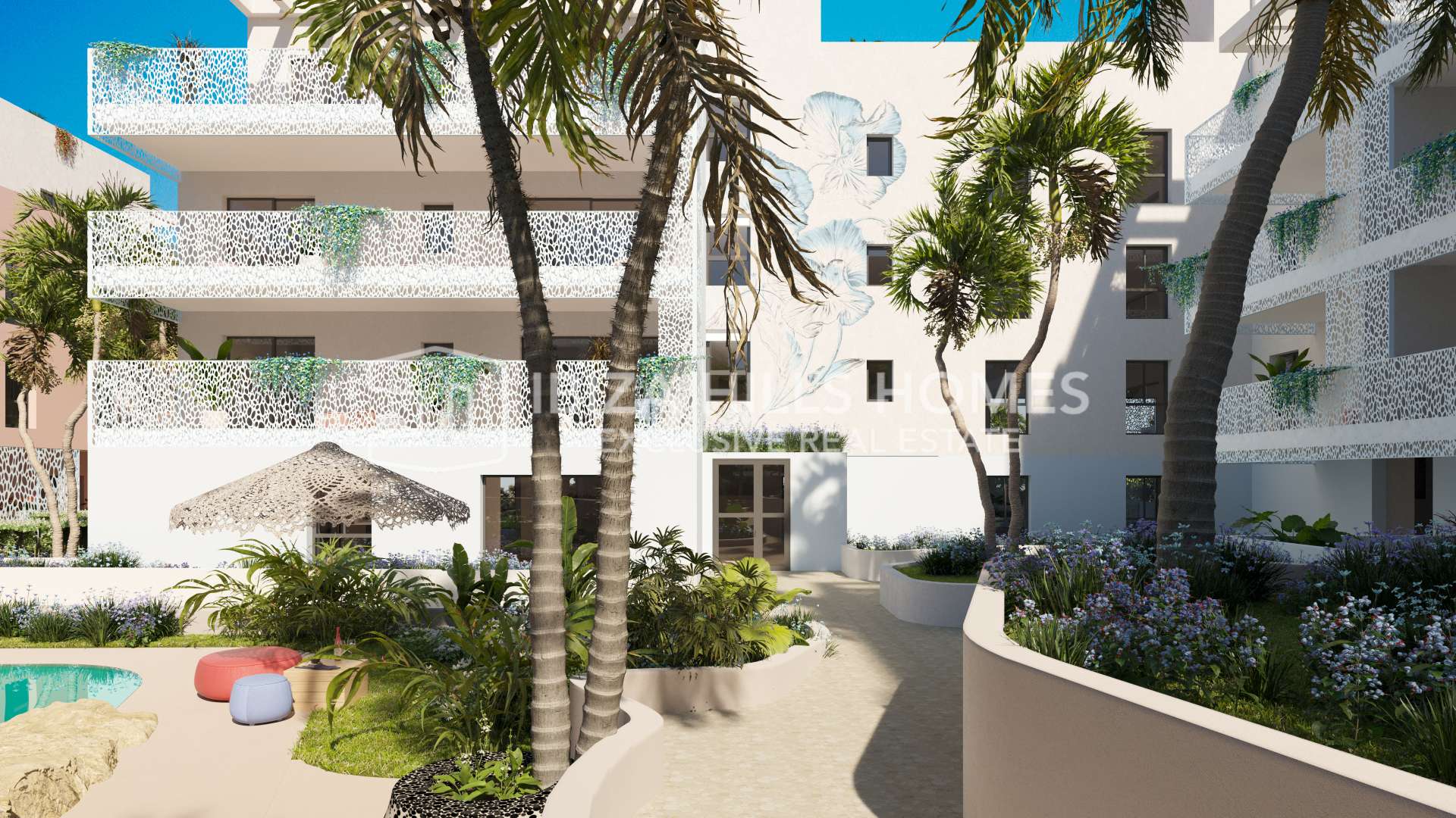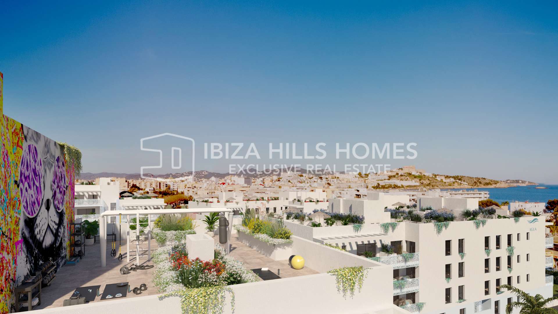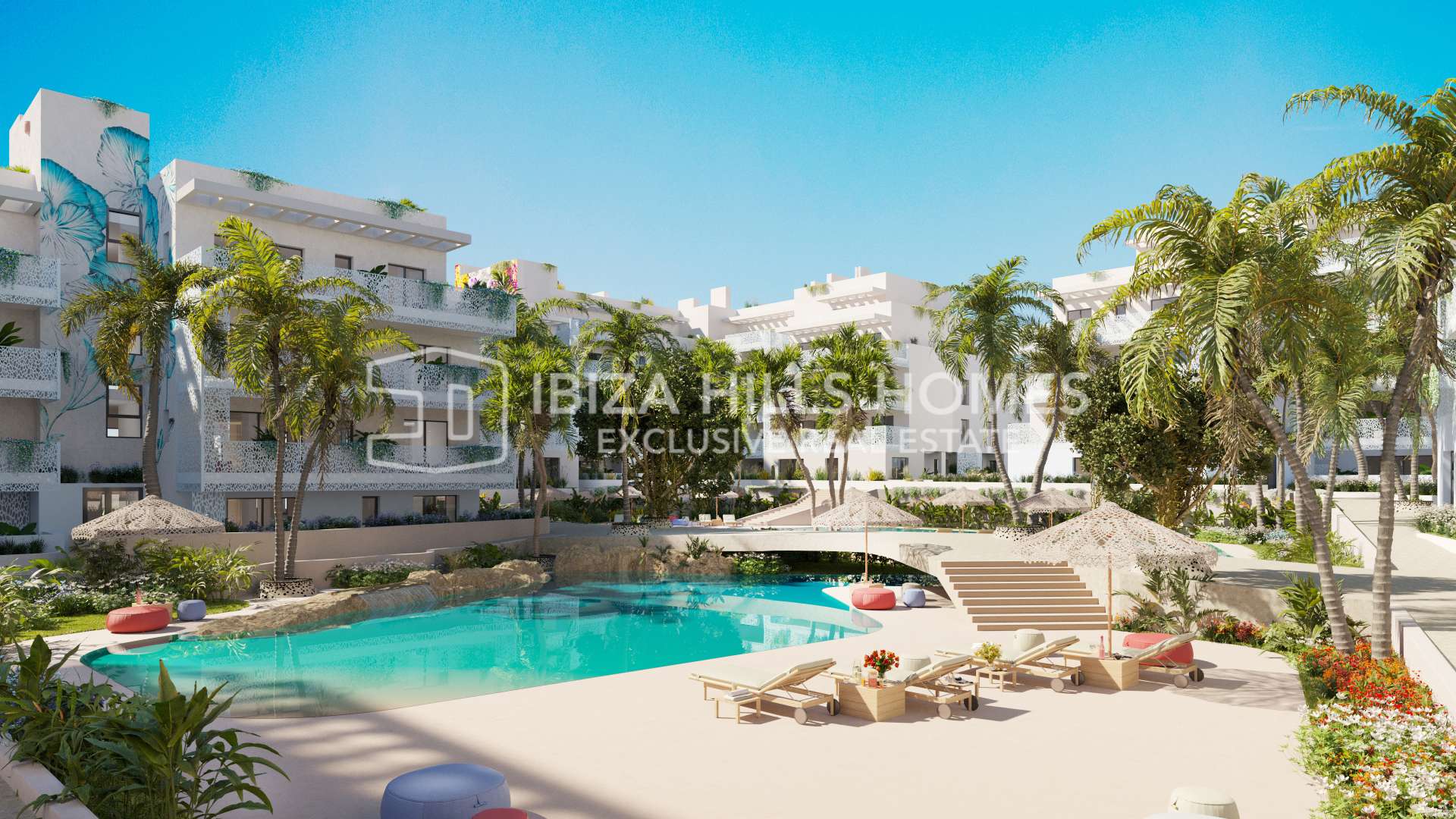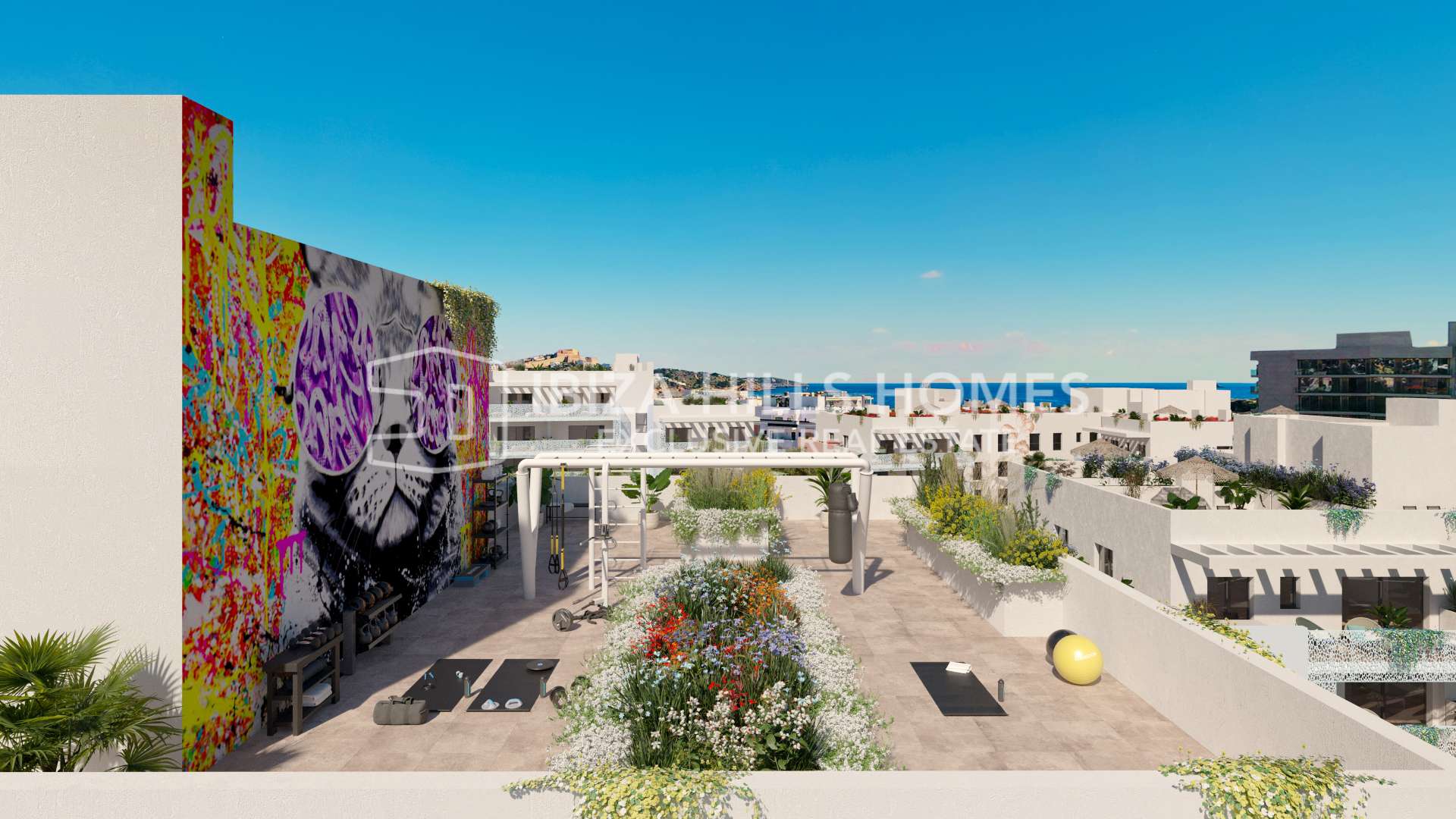 Landscaped gardens and a large, organically shaped swimming pool create a central space for relaxation, while rooftop areas and shared terraces offer views towards the sea, the surrounding hills and Ibiza Town. Additional features such as a rooftop gym further extend the lifestyle concept.