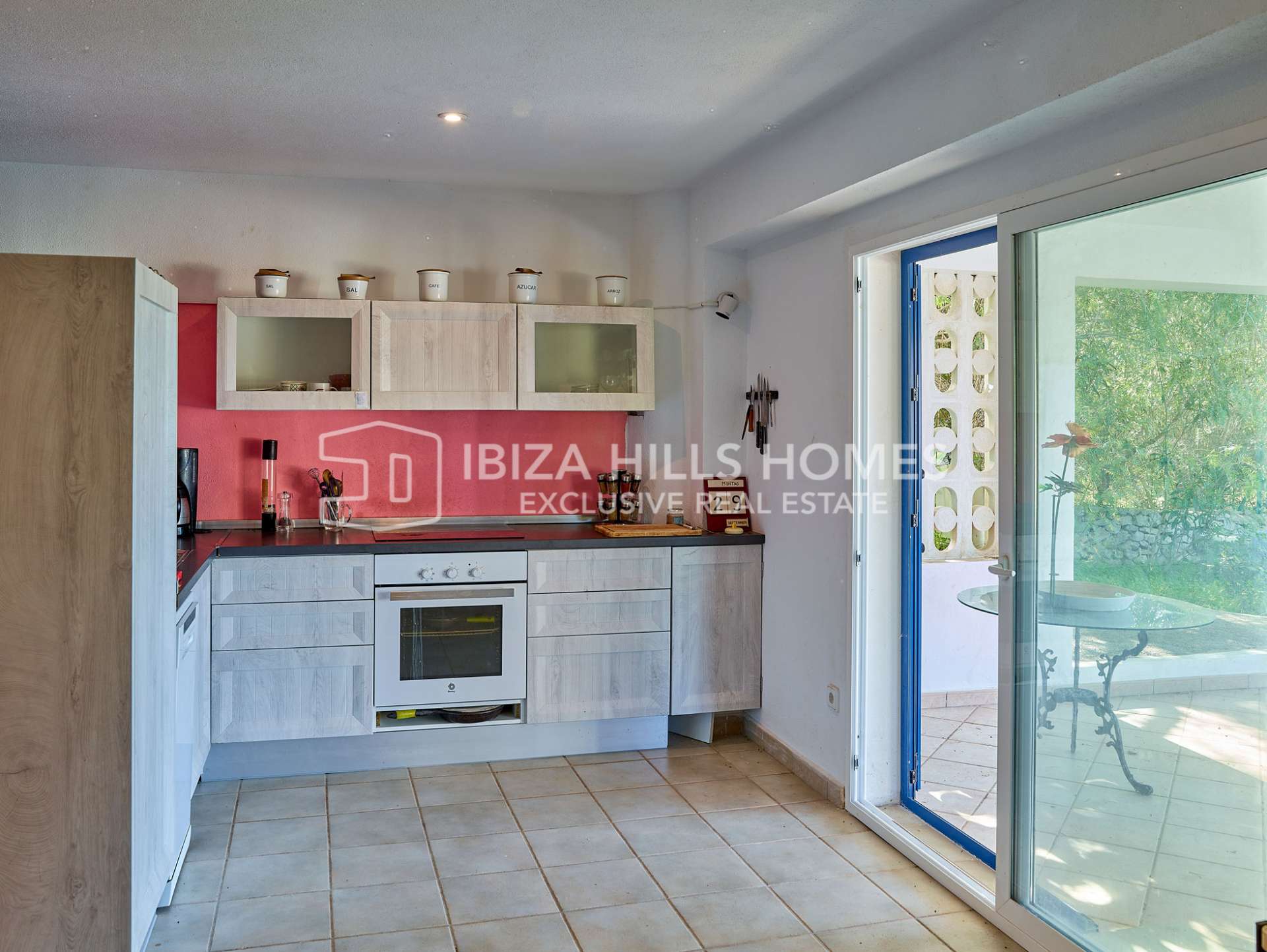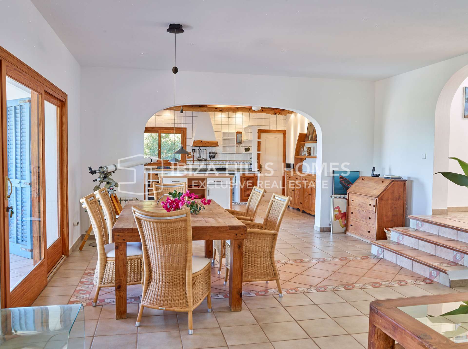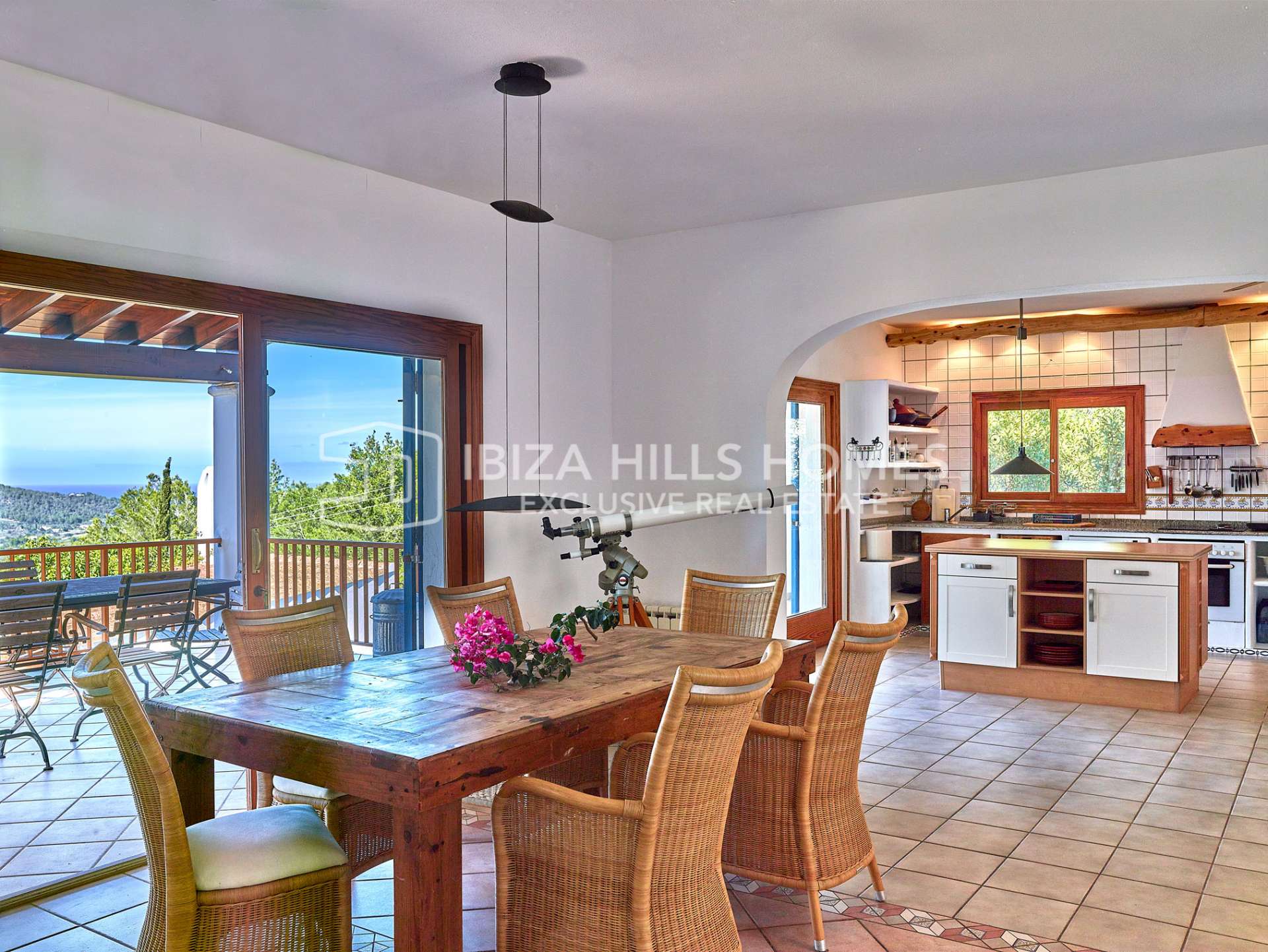 Desde la zona de estar, grandes puertas acristaladas se abren a una amplia terraza cubierta, desde la que se disfrutan agradables vistas al campo y vistas al mar a lo lejos. Gracias a su orientación suroeste, la vivienda goza de abundante luz natural durante todo el año y espectaculares puestas de sol.