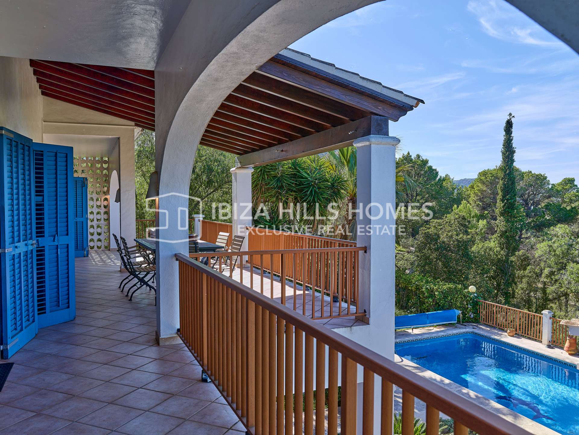 Una escalera desde la terraza conduce a la planta inferior, donde un gran porche cubierto ofrece acceso directo a la piscina y a un cuidado jardín mediterráneo. En este nivel también se encuentra una zona de barbacoa y un apartamento de invitados independiente que incluye un salón con cocina abierta, un dormitorio con baño en suite y varios trasteros. Existe además la posibilidad de crear un dormitorio adicional de amplias dimensiones, según las necesidades.