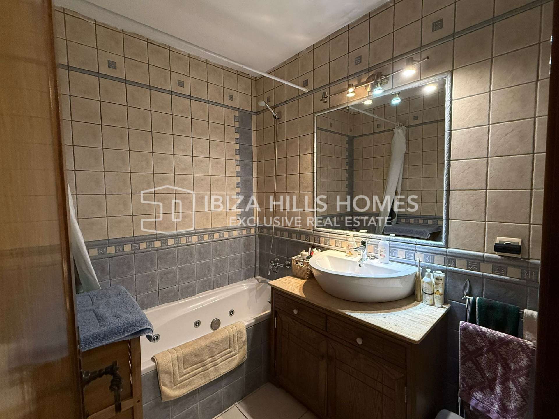 En la planta baja, la propiedad dispone de un luminoso salón, una amplia cocina, dos dormitorios y dos baños. Desde el comedor se accede directamente a un bonito jardín privado, ideal para disfrutar del agradable clima de Ibiza. Una puerta del jardín comunica con la zona comunitaria del complejo.