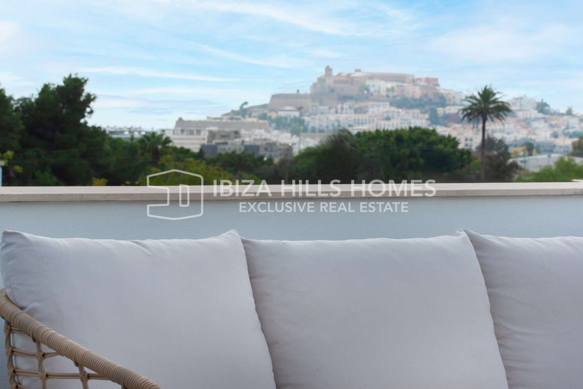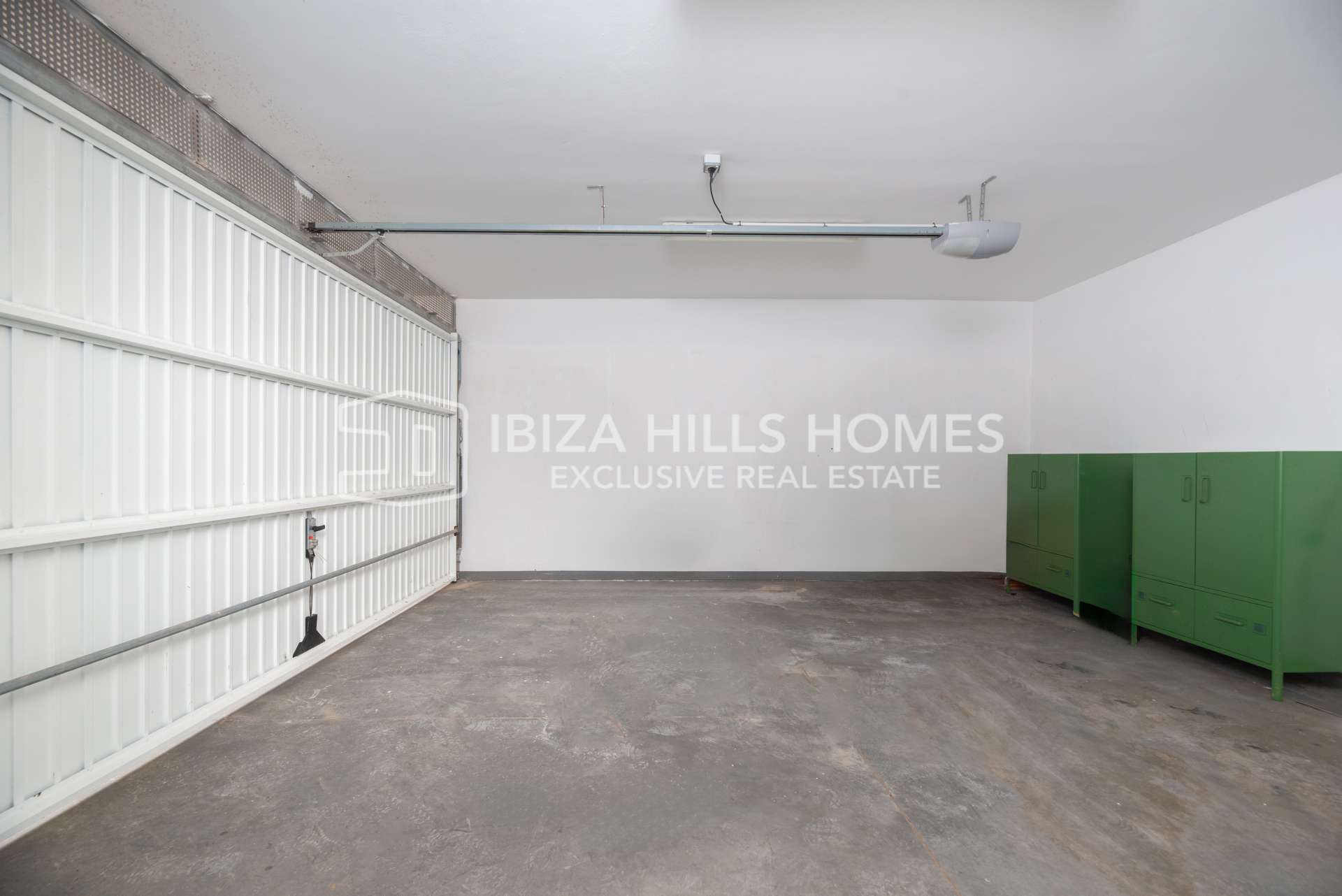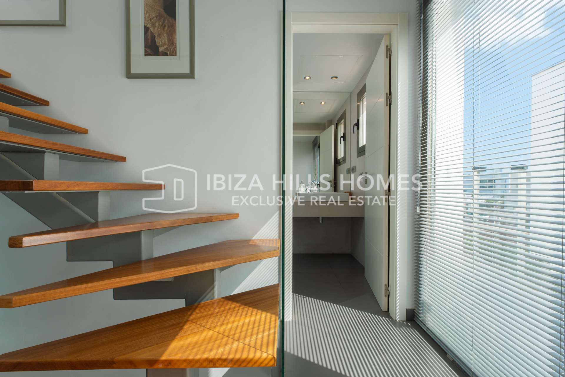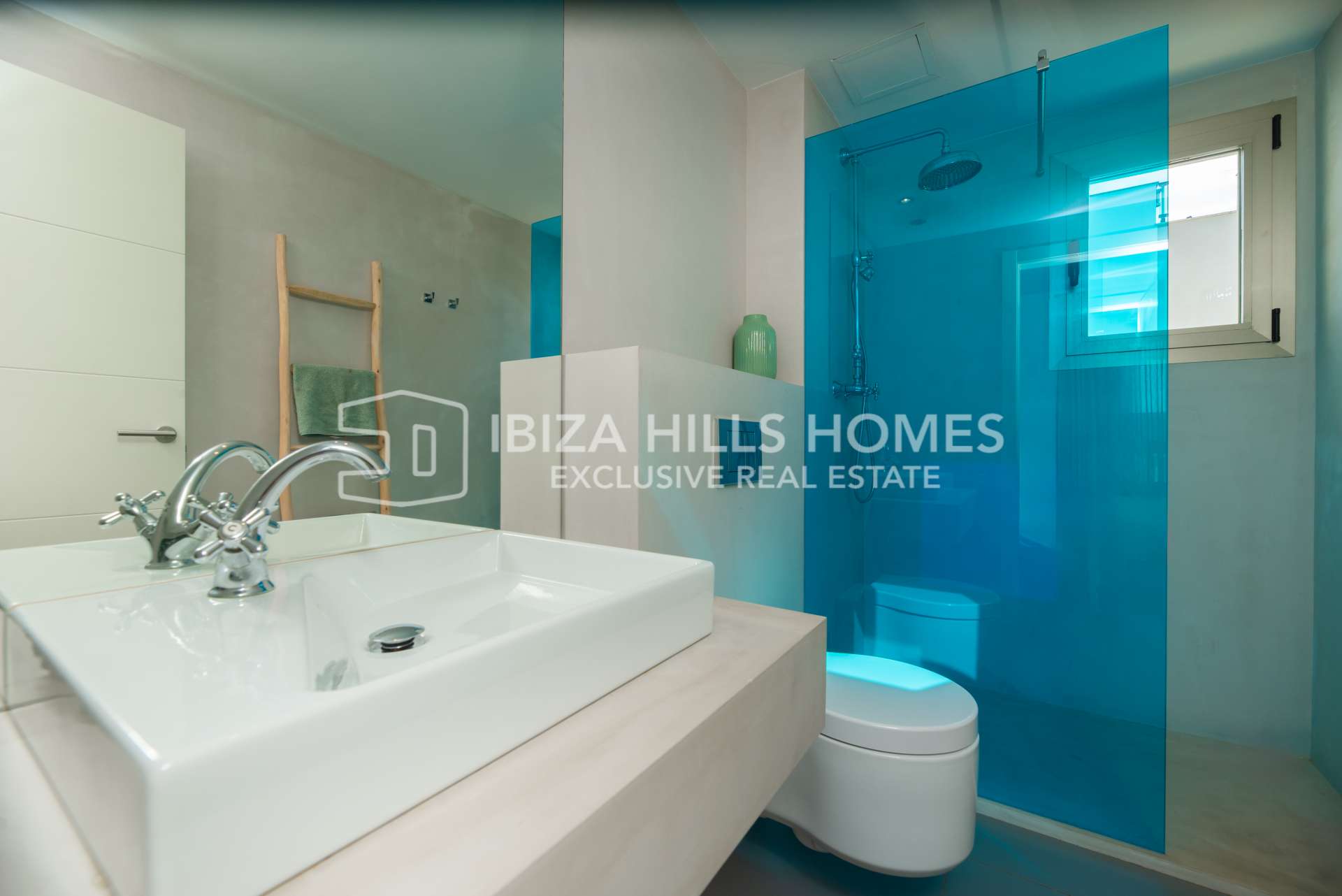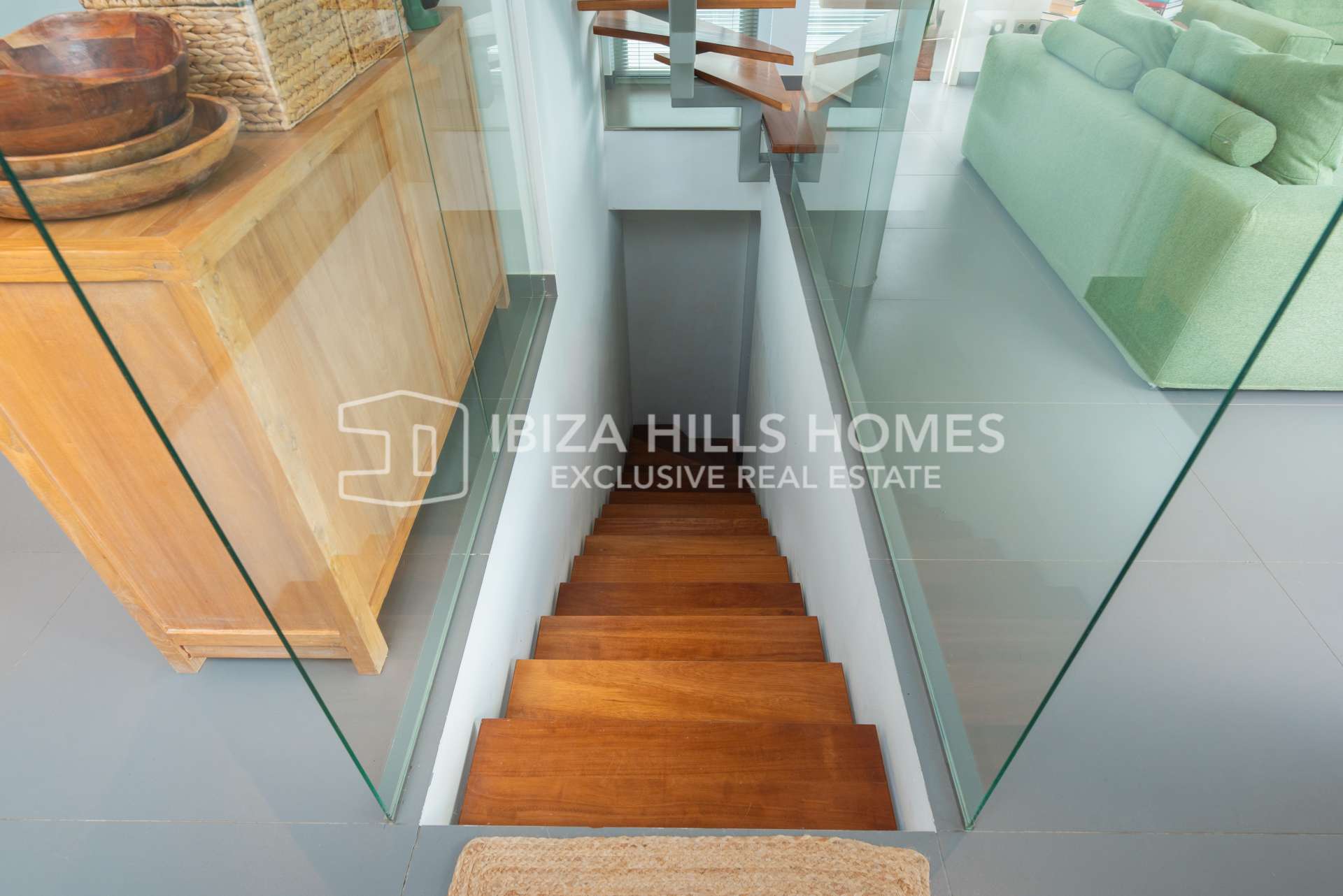Les espaces extérieurs sont conçus pour la détente et la convivialité. Autour de la piscine privée, les terrasses invitent à bronzer, dîner en plein air ou passer de douces soirées autour du barbecue. Le point fort de la propriété est son vaste solarium, offrant des vues panoramiques sur les environs et sur la silhouette emblématique de Dalt Vila — un cadre exceptionnel pour admirer des couchers de soleil inoubliables. Une douche extérieure complète ce niveau, parfaite pour se rafraîchir lors des chaudes journées d’été ou après une séance de yoga matinale.