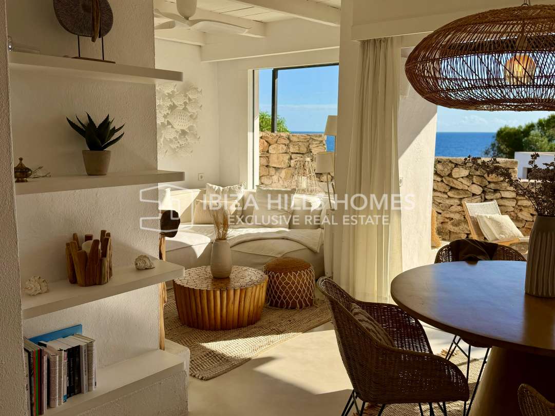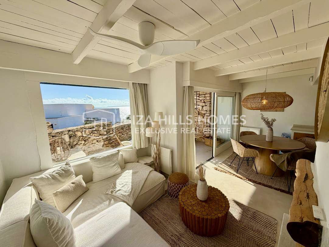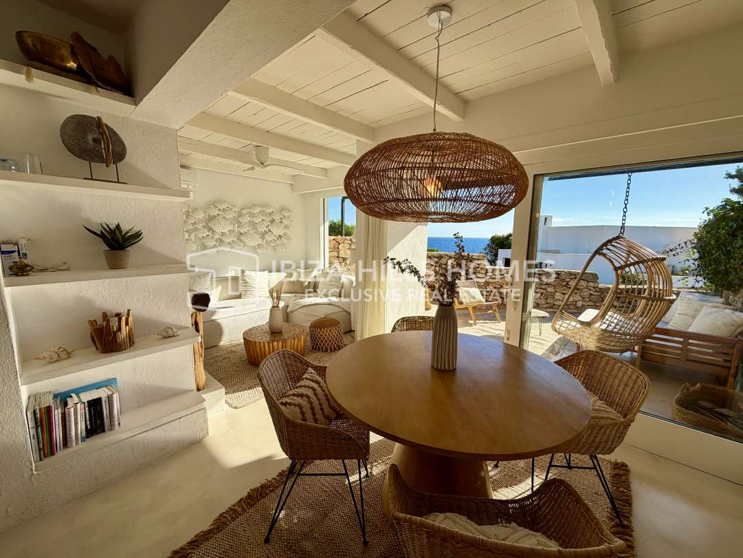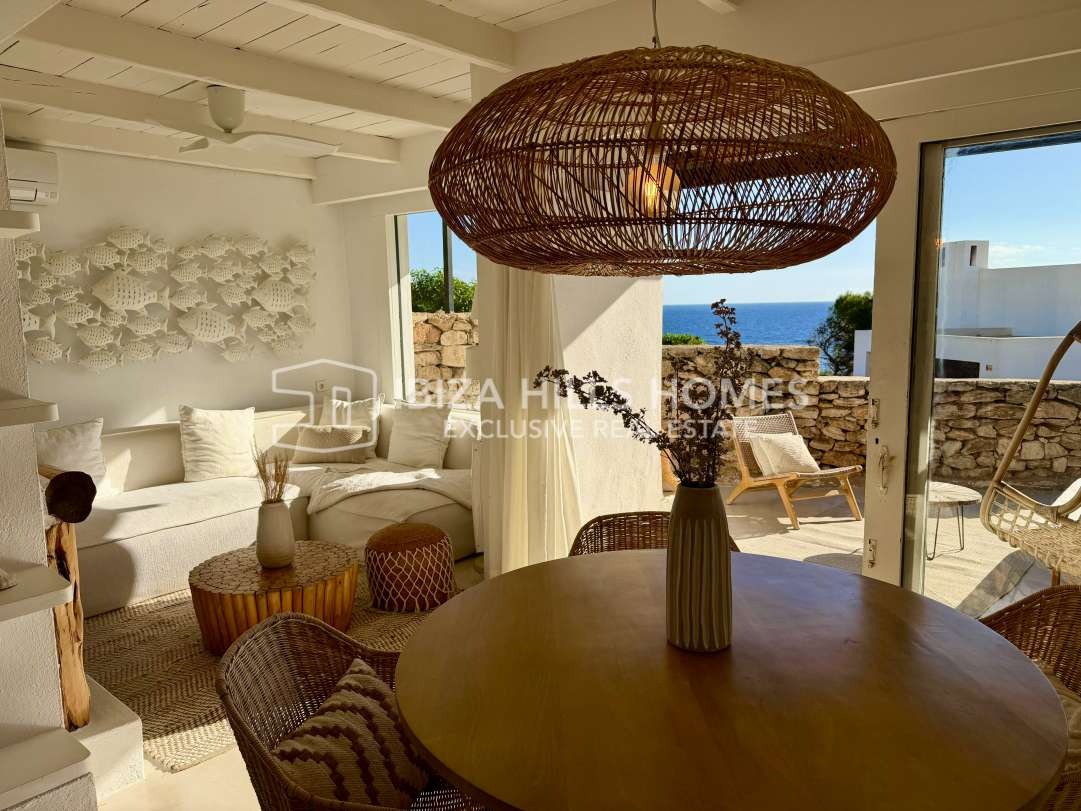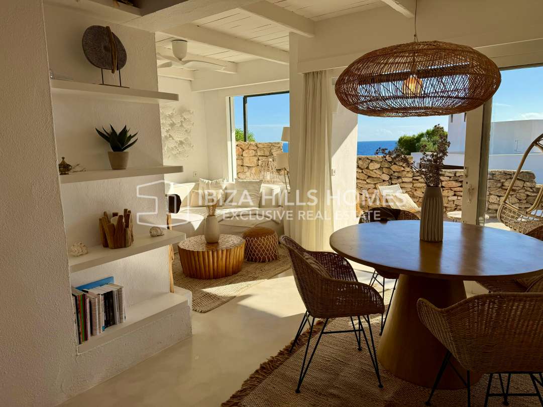 Charmantes renoviertes Reihenhaus in erster Meereslinie in Roca Llisa mit Meerblick bis Formentera, 24h-Sicherheit, Gemeinschaftspool, Kamin und Top-Lage nahe Stränden,...