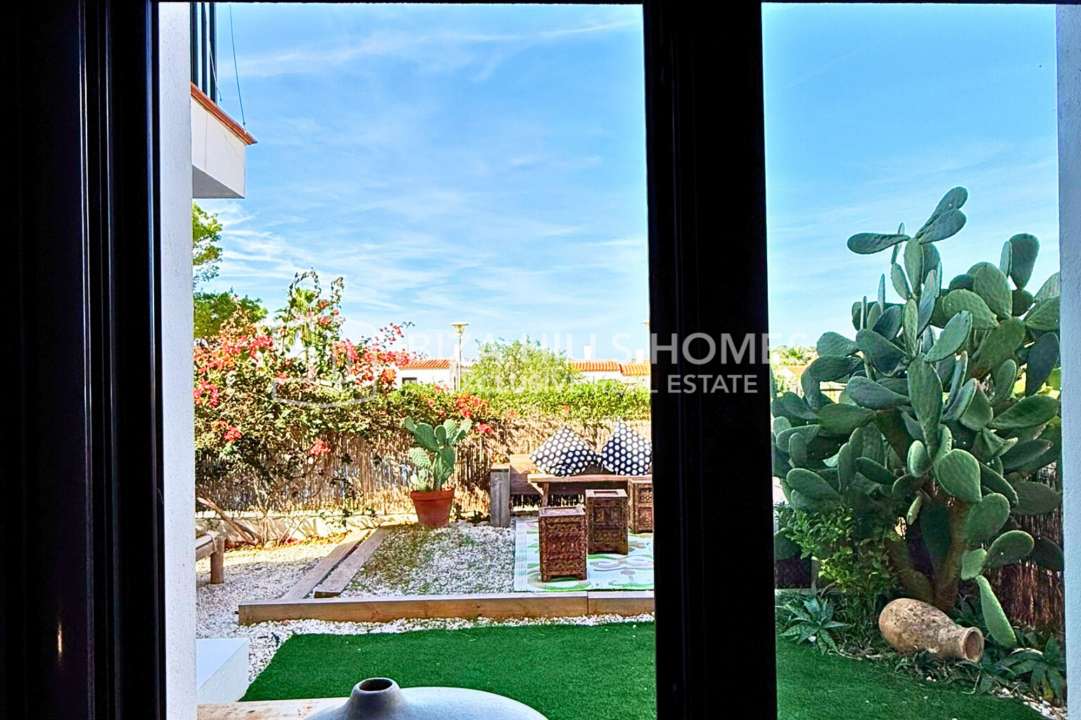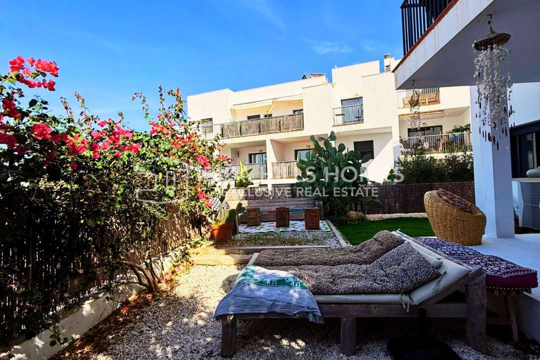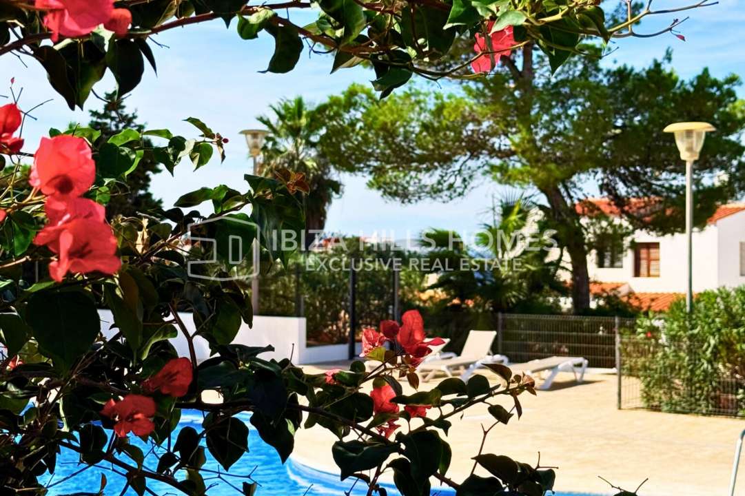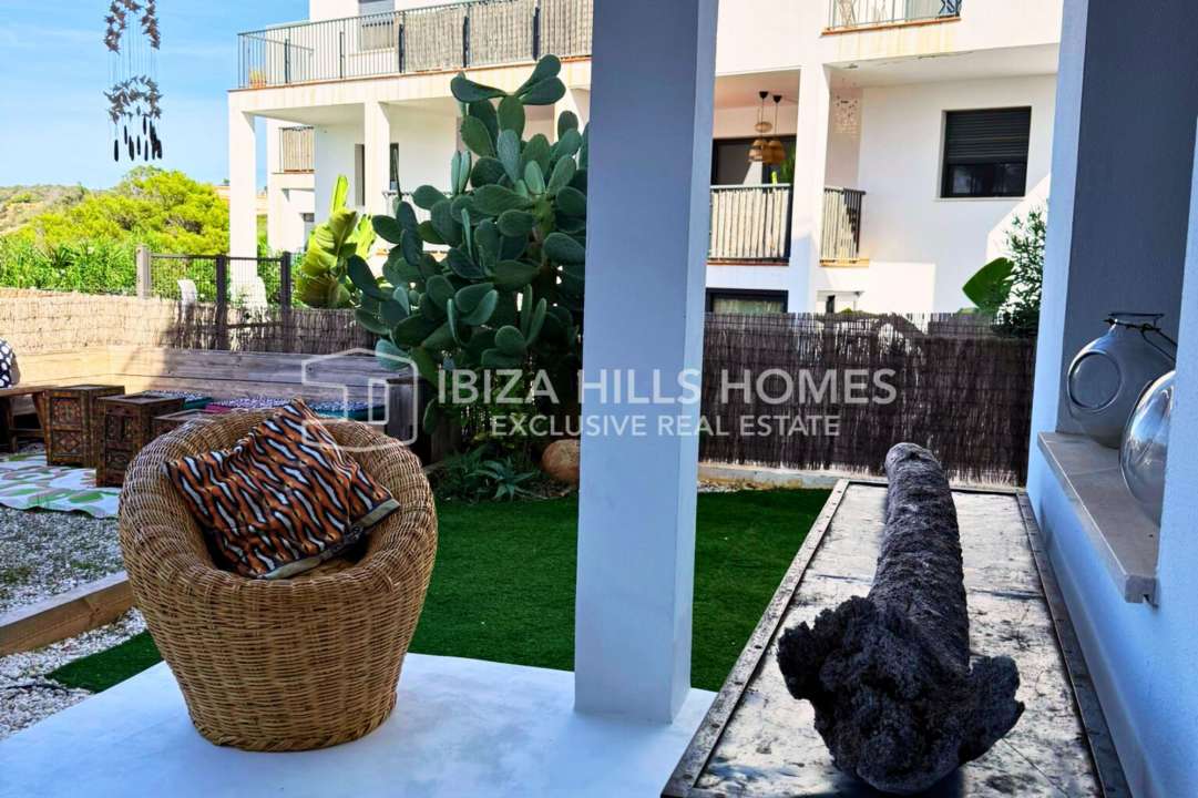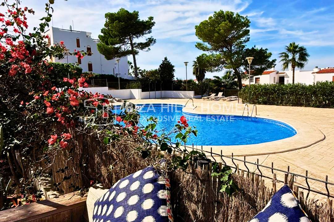 Stylish 3-bedroom corner apartment with private garden in Cala Tarida, Ibiza. Gated community with pool, open-plan living, terrace, parking and walking distance to the beach....