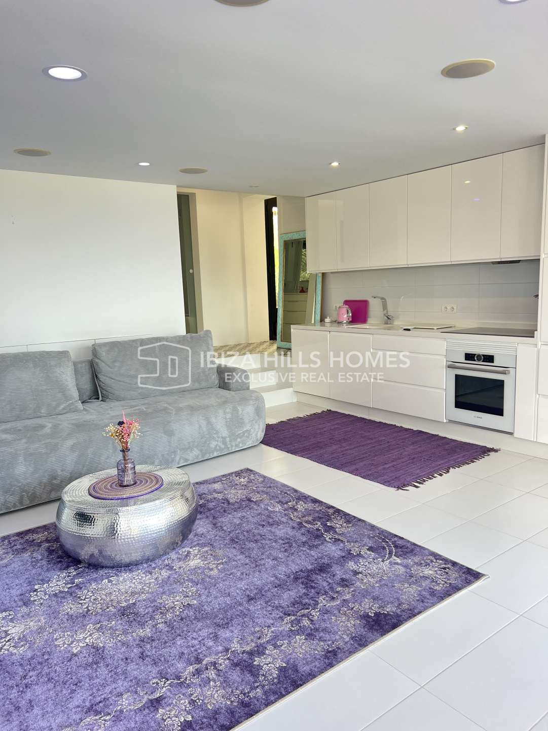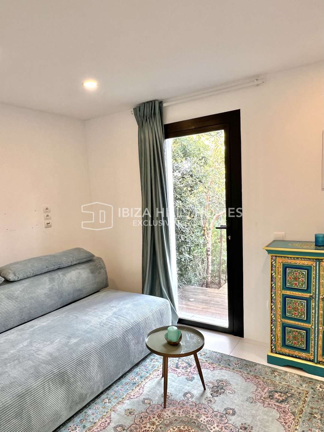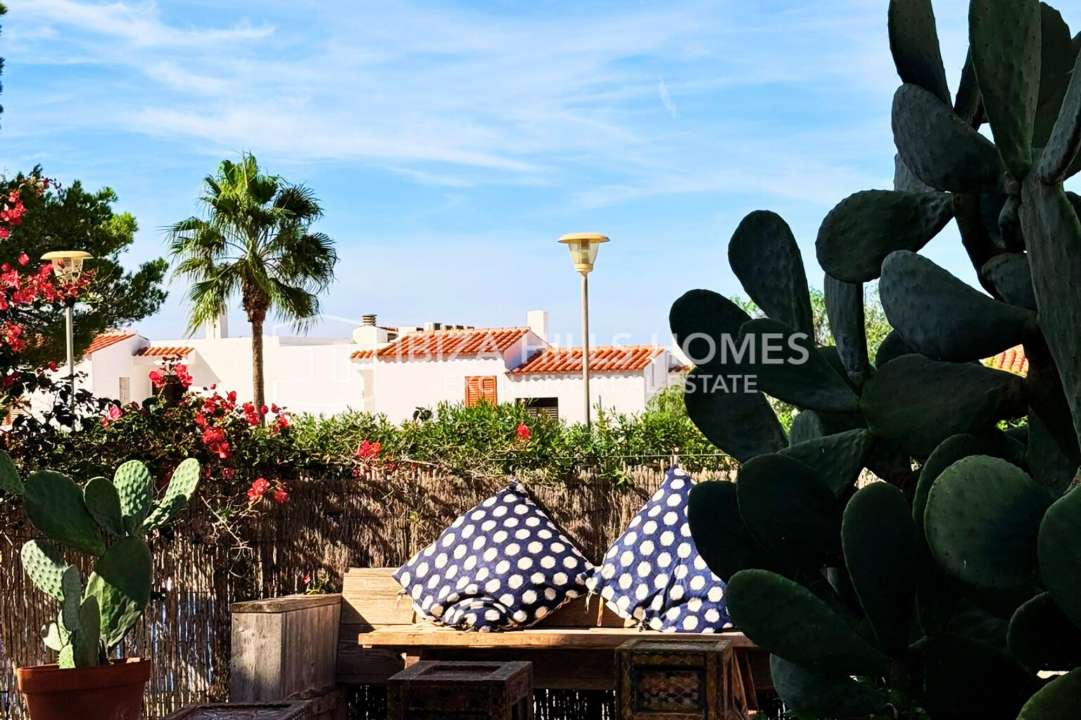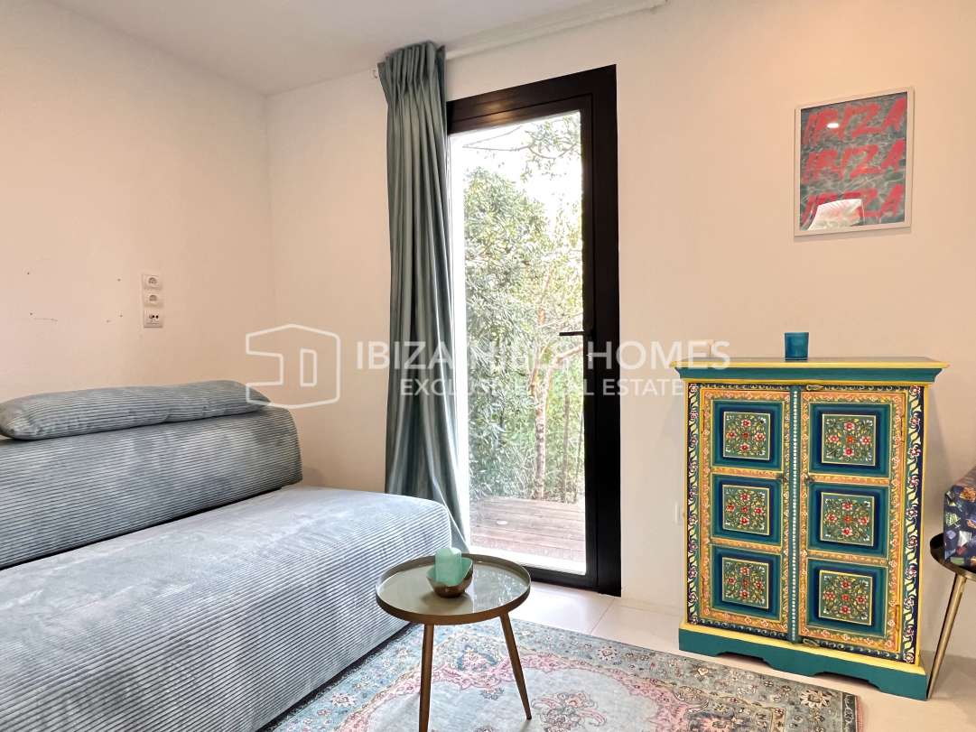 Stylish 3-bedroom corner apartment with private garden in Cala Tarida, Ibiza. Gated community with pool, open-plan living, terrace, parking and walking distance to the beach....