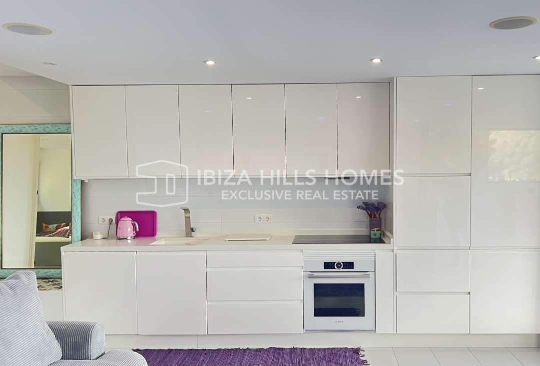 Modern 2-bedroom apartment for sale in Cala Vadella, Ibiza, with sea views, 32 m² terrace, pool, spa, gym, parking and storage, close to the beach.