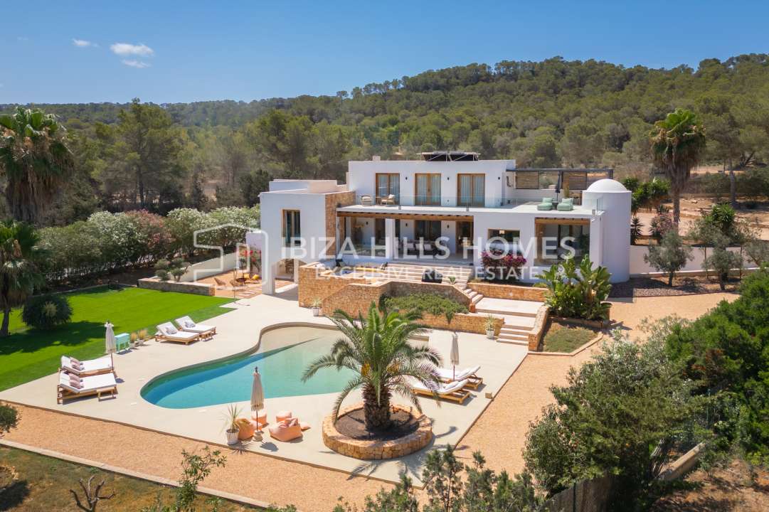 Finca renovada en venta cerca de Sant Josep Ibiza. Villa con casa de invitados, parcela de 10.000 m², piscina, terraza rooftop y vistas panorámicas al campo.
