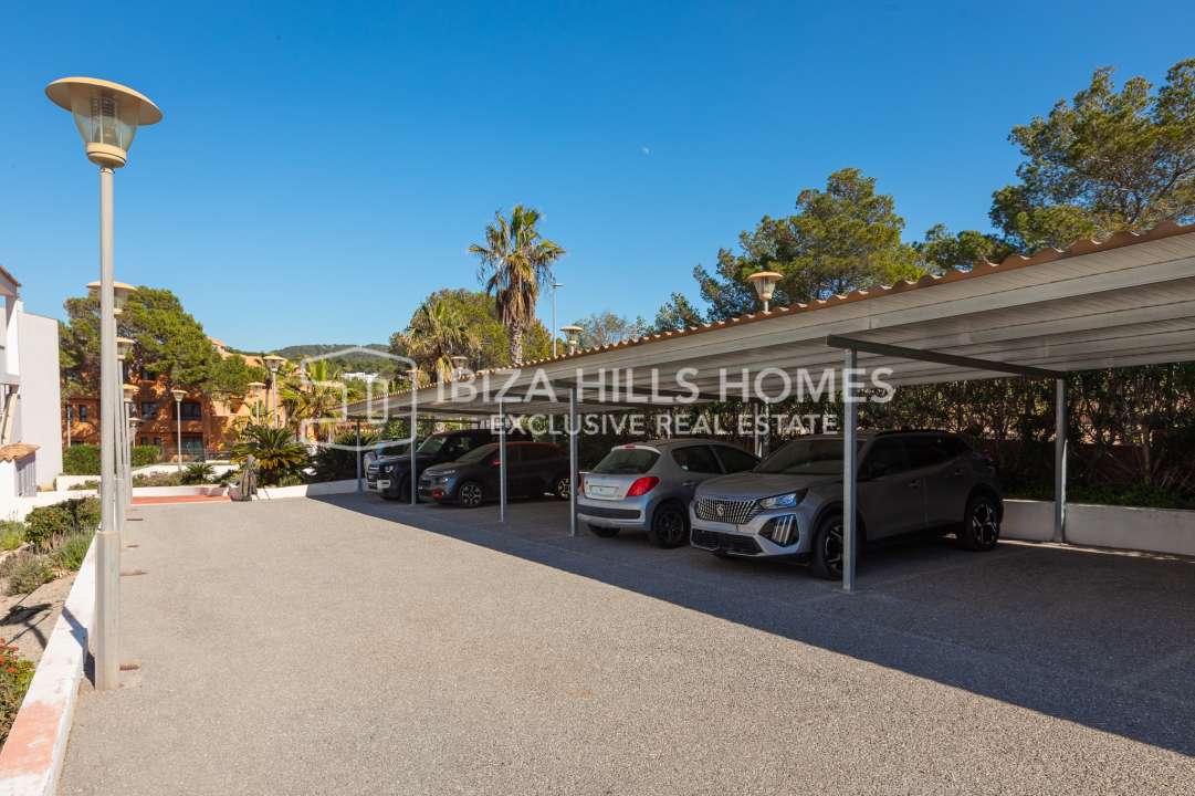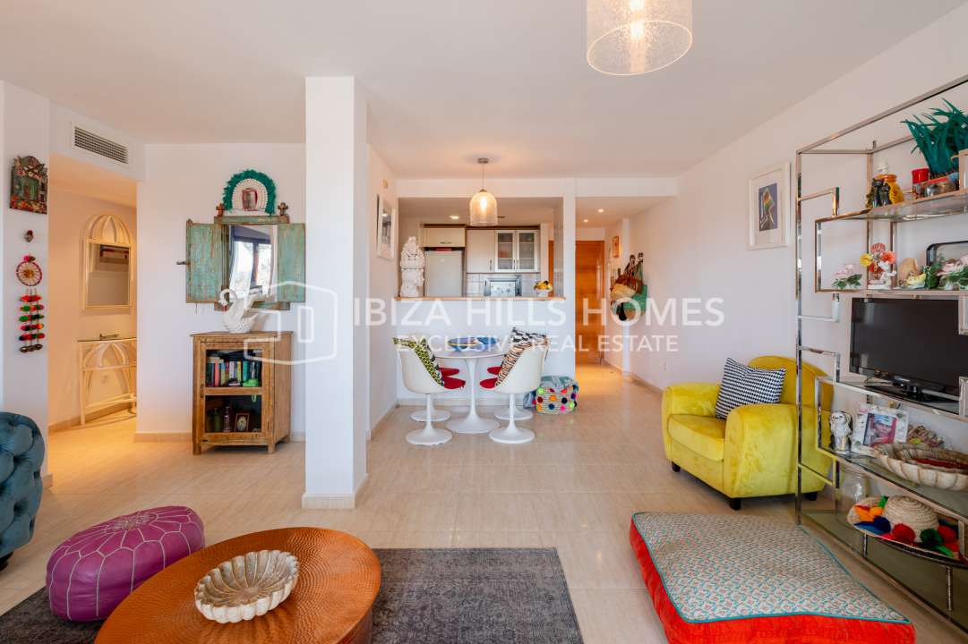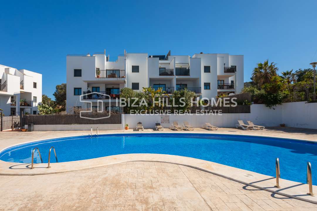 Apartamento de 2 dormitorios totalmente renovado cerca de la playa de Cala Vadella en Ibiza. Vistas al mar, piscina comunitaria, aire acondicionado. Ideal como vivienda vacacional.